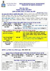 भोपाल, डेस्क रिपोर्ट। बंगाल की खाड़ी में बने कम दबाव क्षेत्र से मध्यप्रदेश में एक बार फिर झमाझम बारिश का दौर शुरू हो गया है। एमपी मौसम विभाग (Meteorological Department) ने आज गुरूवार 22 सितंबर 2022 को सभी संभागों में बारिश की चेतावनी जारी की गई है। दो दर्जन से ज्यादा जिलों में अति भारी से भारी बारिश के लिए येलो-ऑरेंज अलर्ट जारी किया गया है।वही 10 संभागों में गरज चमक के साथ बिजली गिरने और चमकने की चेतावनी जारी की है। सितंबर के अंतिम सप्ताह में मप्र के कुछ क्षेत्राें से मानसून विदा हाेने की शुरुआत हाेने की भी संभावना है।