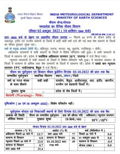 भोपाल, डेस्क रिपोर्ट। बंगाल की खाड़ी में चक्रवातीय घेरा विकसित हो गया है जो 48 घंटों में मजबूत होकर आगे बढ़ेगा और 4 से 8 अक्टूबर के बीच मध्यम से तेज बारिश हो सकती है। 3 अक्टूबर को प्रदेश के पूर्वी हिस्से व 4 अक्टूबर को प्रदेश के सभी हिस्सों में गरज-चमक के साथ बौछारें पड़ने व बिजली गिरने होगी। एमपी मौसम विभाग (MP Meteorological Department) ने आज रविवार 2 अक्टूबर 2022 को 9 जिलों में बारिश की संभावना है।इधर, इंदौर से अक्टूबर माह में पहले सप्ताह में मानसून के विदा होने की संभावना जताई जा रही है।