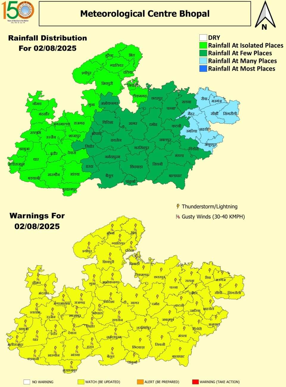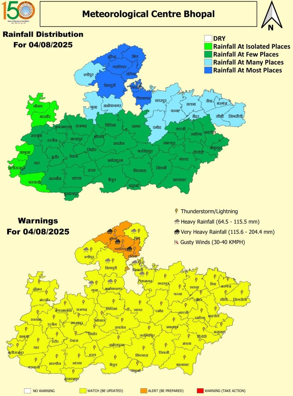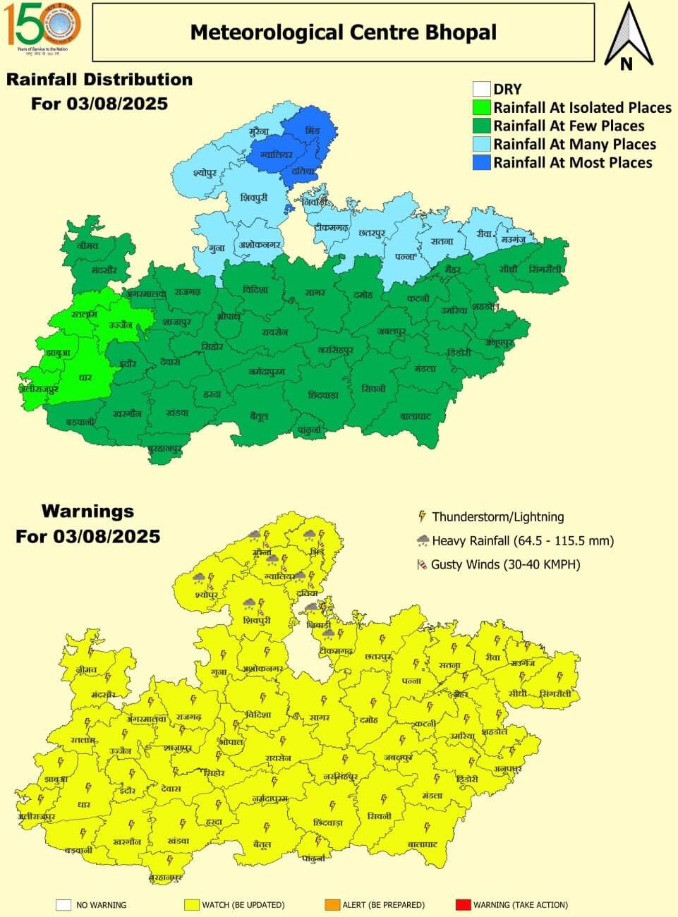 - प्रदेश की सामान्य बारिश औसत 37 इंच है। प्रदेश के ग्वालियर, राजगढ़, शिवपुरी, गुना, अशोकनगर, छतरपुर, टीकमगढ़, निवाड़ी, मुरैना और श्योपुर में बारिश का कोटा पूरा हो गया है। यहां सामान्य से 50% तक ज्यादा पानी गिर चुका है।इंदौर, उज्जैन, शाजापुर, भोपाल, बुरहानपुर, जबलपुर और आगर-मालवा अभी भी कम पानी गिरा है। इंदौर और उज्जैन संभाग में कम ही वर्षा हुई है।