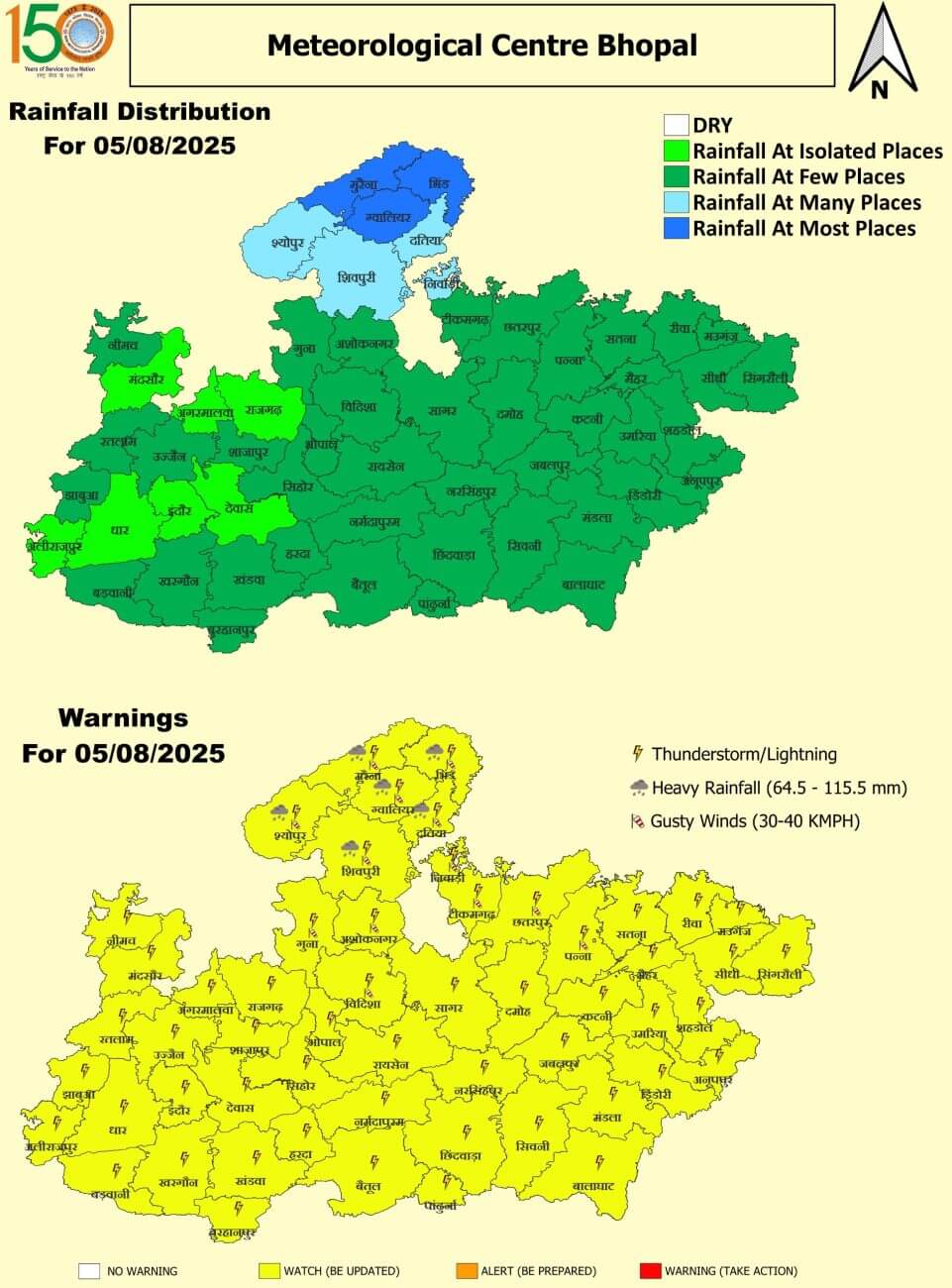 ग्वालियर व चंबल और सागर संभाग के जिलों में तेज बारिश हो सकती है। ग्वालियर, शिवपुरी, गुना, दतिया, अशोकनगर, भिंड, मुरैना, श्योपुर, शहडोल, उमरिया, अनूपपुर, सागर, छतरपुर, दमोह, पन्ना, टीकमगढ़, निवाड़ी, रीवा, सतना, सीधी, सिंगरौली, मऊगंज और मैहर में हल्की से मध्यम बारिश हो सकती है।