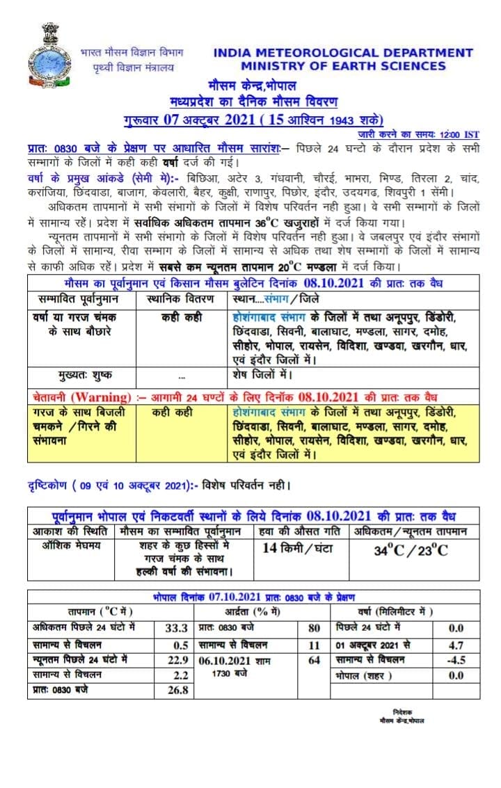 शहर में दिन और रात का तापमान क्रमश: 32 डिग्री सेल्सियस और 20 डिग्री सेल्सियस रहेगा, जबकि हवा की औसत गति 12 किलोमीटर प्रति घंटा होगी। मौसम विभाग ने राज्य के लिए पूर्वानुमान में होशंगाबाद संभाग, अनूपपुर, डिंडोरी, सिवनी, भोपाल, रायसेन, विदिशा, खंडवा, खरगोन, धार और इंदौर में गरज चमक के साथ बारिश और बिजली गिरने की चेतावनी जारी की है।