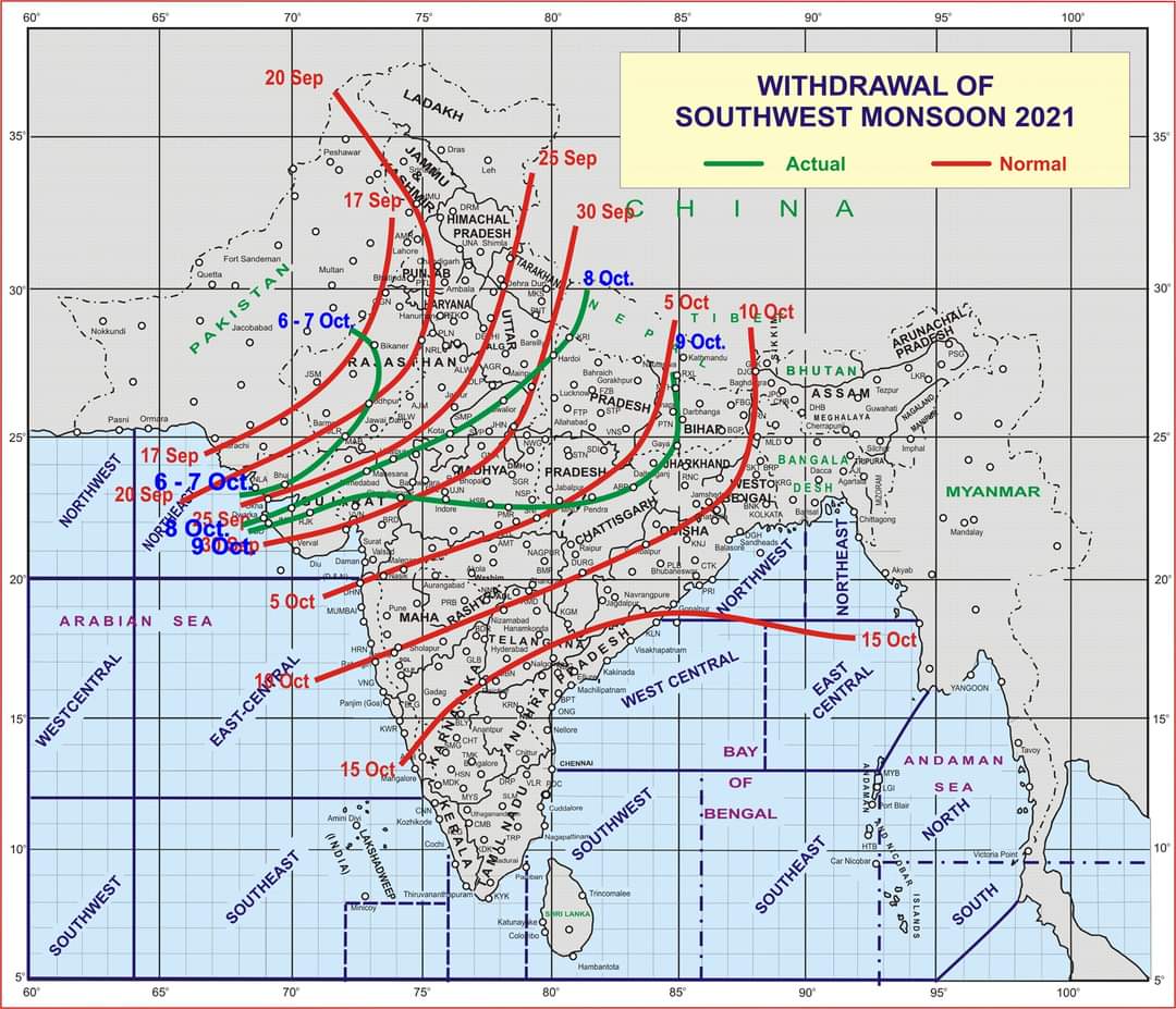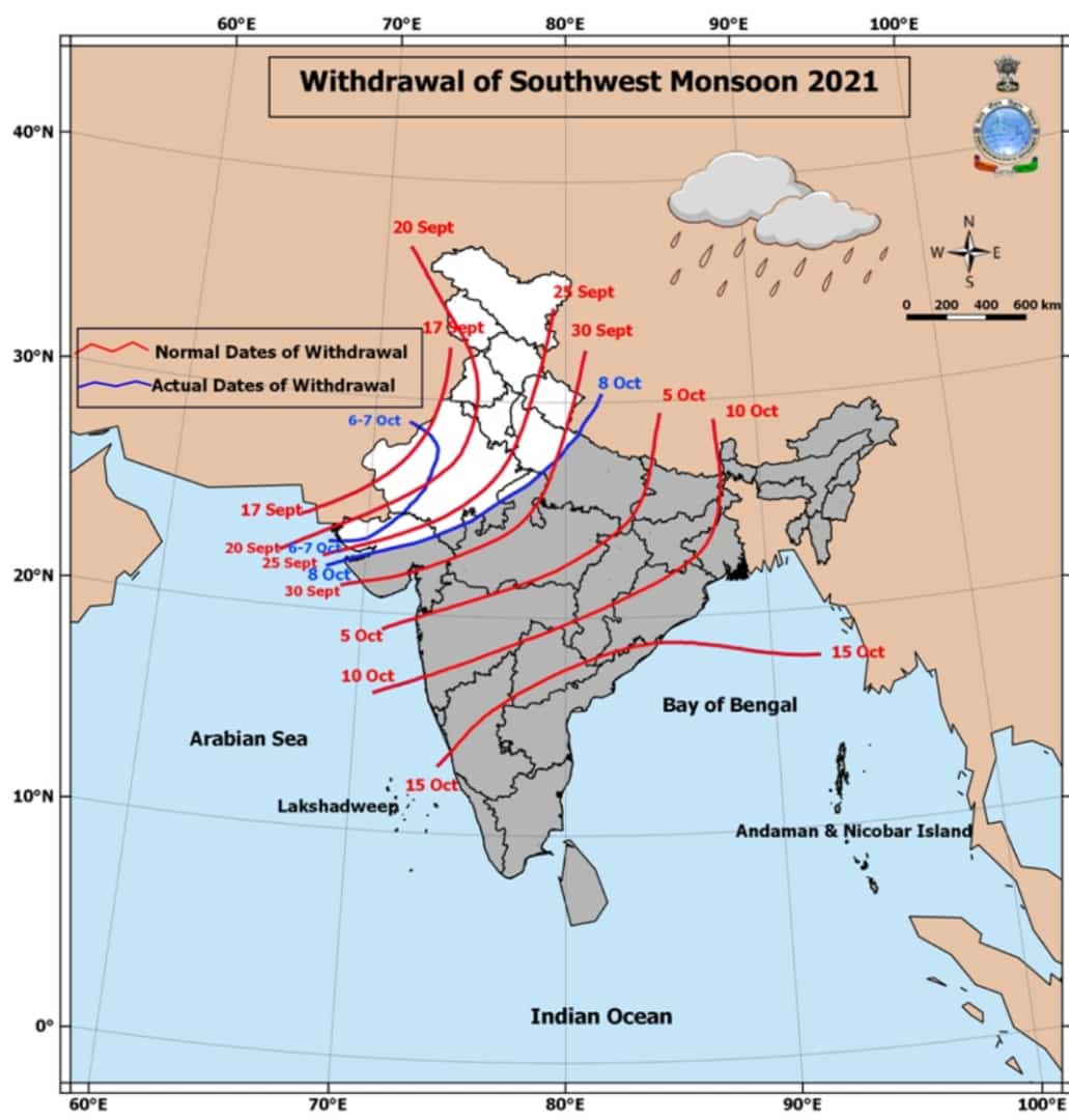 मौसम विभाग का पूर्वानुमान (MP Weather Update) है कि हवाओं का रुख बार बार बदलने लगा है। ग्वालियर, मुरैना, श्योपुर कलां और नीमच जिलों से 8 अक्टूबर 2021 को मॉनसून की विदाई हो गई है, जो कि समान्य तिथि 30 सितंबर 2021 से 8 दिन विलम्ब है। वही भिंड, दतिया, शिवपुरी, अशोकनगर, गुना, मंदसौर, उज्जैन, रतलाम, झाबुआ, धार, इंदौर, आगर, देवास, शाजापुर, होशंगाबाद, नरसिंहपुर, जबलपुर, मंडला, डिंडोरी जिलों तथा सागर, रीवा, भोपाल और शहडोल संभागों के जिलों से आज मॉनसून की विदाई 09 अक्टूबर 2021 हुई है, जो कि समान्य तिथि 05 अक्टूबर से 4 दिन देरी है।