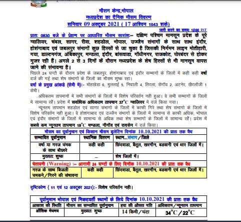 भोपाल, डेस्क रिपोर्ट। वातावरण मे नमी की कमी के चलते मध्यप्रदेश (MP Weather Today) का मौसम धीरे धीरे बदलने लगा है और ग्वालियर-चंबल समेत कई जिलों से मानसून की विदाई का सिलसिला भी शुरु हो गया है। एमपी मौसम विभाग (MP Weather Department) की मानें तो 3-4 दिन के अंदर मानसून की सभी जिलों से विदाई हो जाएगी, वही आज शनिवार 9 अक्टूबर 2021 को 5 जिलों में बारिश की संभावना है और 5 जिलों में बिजली गिरने और चमकने के चलते येलो अलर्ट जारी किया गया है।