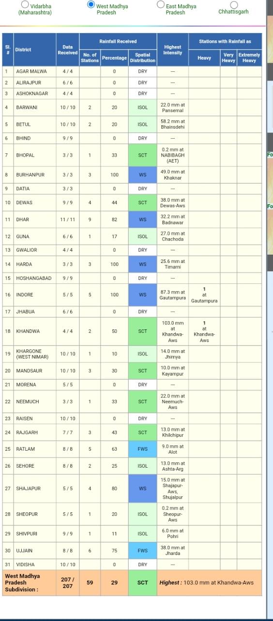 पिछले 24 घंटों के दौरान शनिवार सुबह साढ़े आठ बजे तक खंडवा में 103, धार में 26.6, शाजापुर में 15, इंदौर में 5.2, रतलाम में चार और उज्जैन में 3.4 मिलीमीटर बारिश हुई।