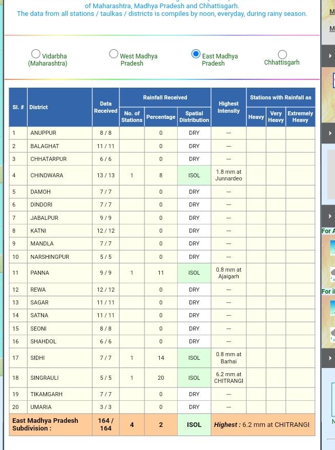 मौसम विभाग (MP Weather Forecast) के अनुसार, हवा की दिशा अब उत्तरी और उत्तर-पश्चिमी होने के साथ बंगाल की खाड़ी में भी हवा का रुख पूर्वी होने लगा है वही मध्यप्रदेश के मध्य में विपरीत दिशा की हवाओं का टकराव होने से शनिवार-रविवार को भोपाल, इंदौर, होशंगाबाद संभागों के जिलों में कहीं–कहीं गरज–चमक के साथ बौछारें पड़ने की संभावना बनी हुई है। अबतक हुई बारिश के बावजूद 9 जिले धार, होशंगाबाद, छतरपुर, दमोह, पन्ना, जबलपुर, सिवनी और बालाघाट रेड जोन में है।