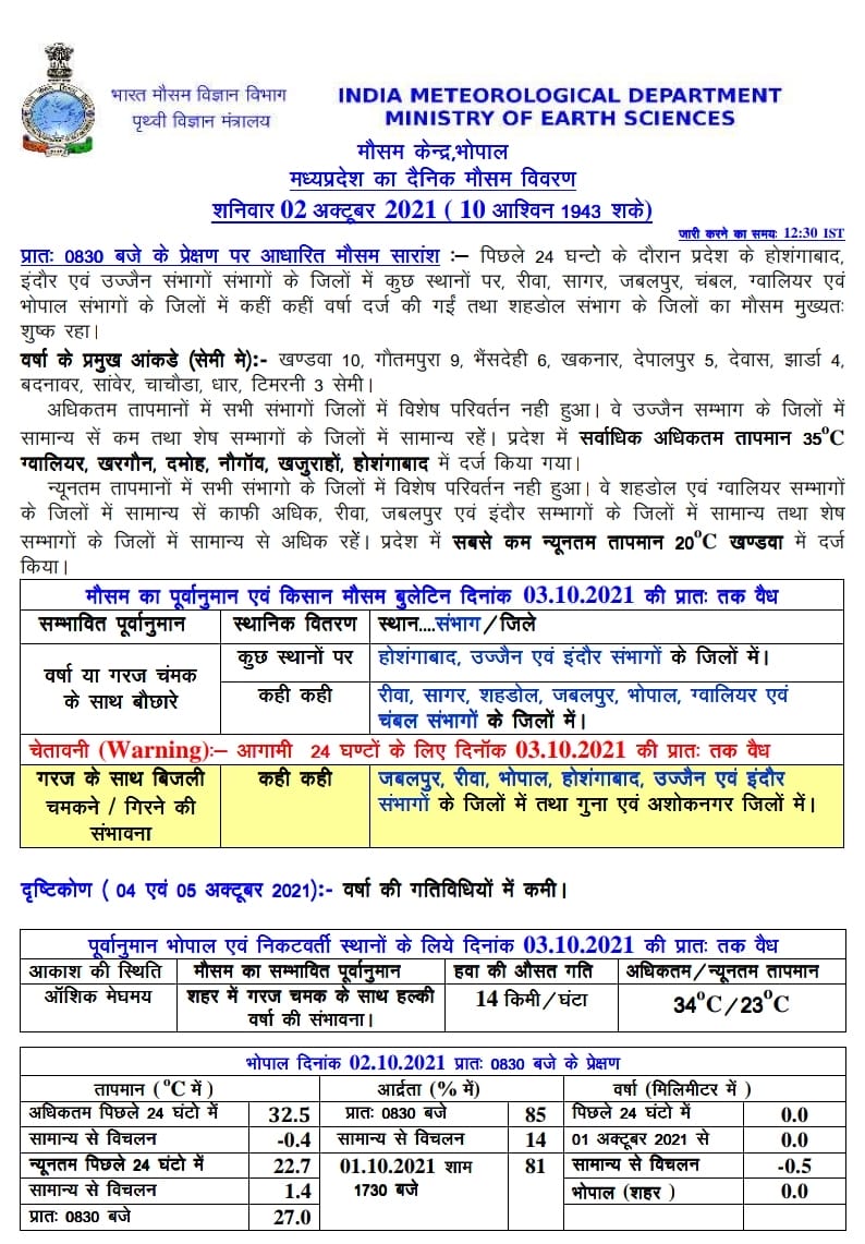 मौसम विभाग (MP Weather Update) ने आज शनिवार 2 अक्टूबर 2021 को प्रदेश के उज्जैन, होशंगाबाद, और इंदौर संभागों में कुछ स्थानों और ग्वालियर, जबलपुर, रीवा, भोपाल,सागर, शहडोल और चंबल में कहीं कही बारिश ( Rain) की संभावना है। वही भोपाल, इंदौर, उज्जैन, होशंगाबाद, रीवा और जबलपुर संभागों के साथ गुना और अशोकनगर जिलों में बिजली गिरने और चमकने की चेतावनी जारी करते हुए येलो अलर्ट जारी किया गया है। पश्चिमी मप्र में देवास, खंडवा, खरगोन, उज्जैन, इंदौर, धार, रतलाम, मंदसौर, बड़वानी, झाबुआ व आलीराजपुर जिलों में कहीं-कहीं कम समय में तेज बारिश और बिजली गिरने की संभावना हैं ।