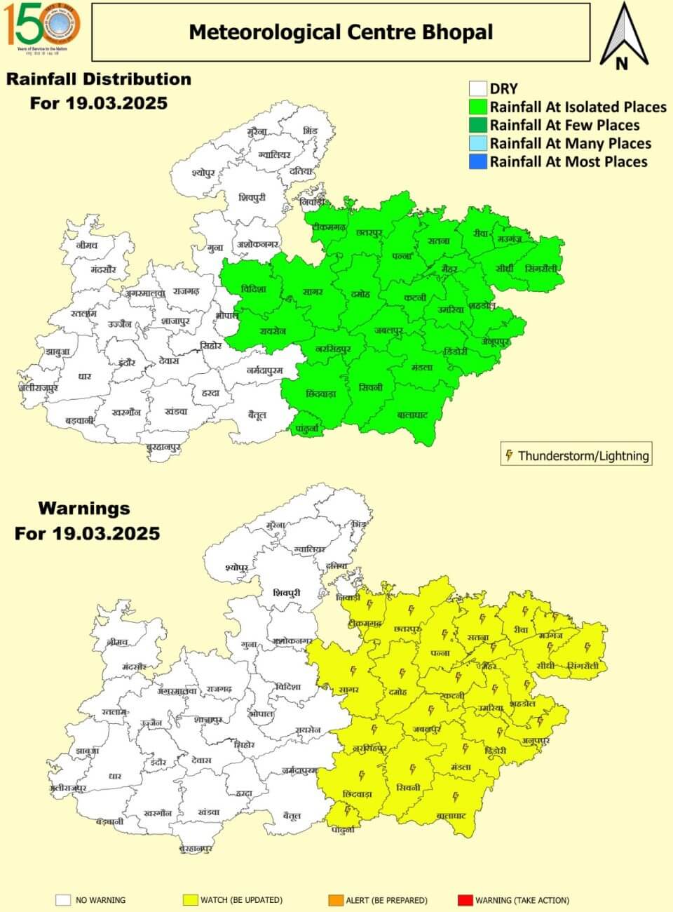 - 20 मार्च गुरूवार: जबलपुर, श्योपुर, शिवपुरी, अशोकनगर, दतिया, निवाड़ी, टीकमगढ़, छतरपुर, पन्ना, दमोह, सागर, विदिशा, रायसेन, नरसिंहपुर, नर्मदापुरम, छिंदवाड़ा, पांढुर्णा, सिवनी, बालाघाट, मंडला, डिंडोरी, अनूपपुर, उमरिया, शहडोल, कटनी, मैहर, सतना, रीवा, मऊगंज, सीधी और सिंगरौली में तेज आंधी, गरज-चमक और बारिश ।