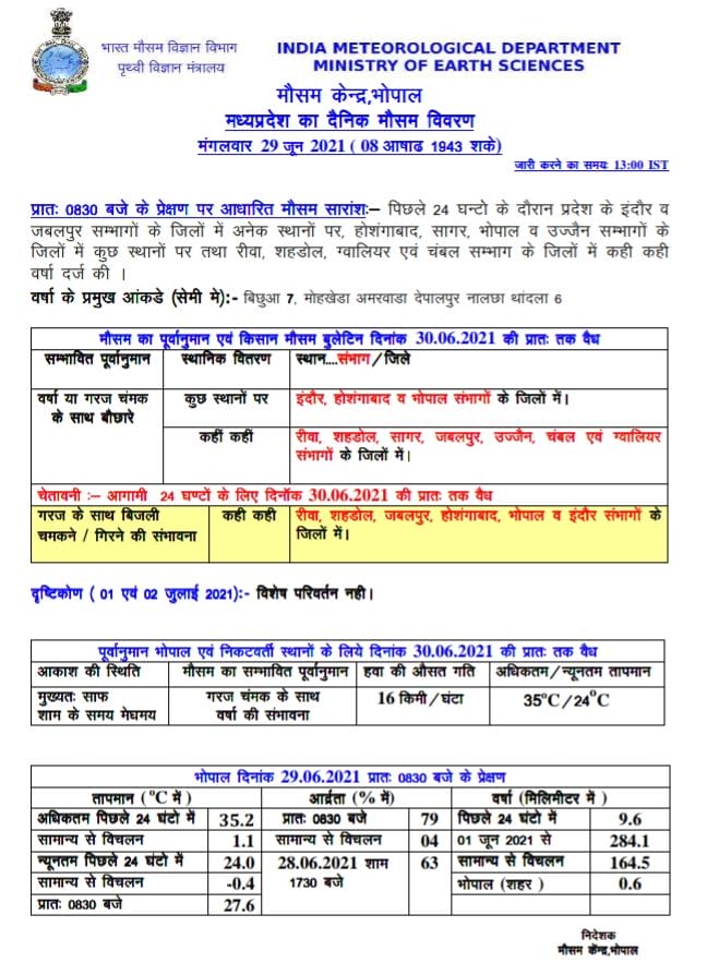 मौसम विभाग (MP Weather Alert) ने आज 29 जून मंगलवार को सभी भोपाल, इंदौर, उज्जैन, ग्वालियर, चंबल, जबलपुर, होशंगाबाद, सागर, रीवा एवं शहडोल संभाग के जिलों में कुछ स्थानों पर बारिश की संभावना जताई हैं। वही रीवा, शहडोल, भोपाल, इंदौर, जबलपुर और होशंगाबाद संभागों के जिलों में बिजली चमकने और गिरने के साथ 16 प्रति घंटा की रफ्तार से हवा चलने के भी आसार है। इसके लिए येलो अलर्ट जारी किया गया है।वर्तमान में कोई सिस्टम एक्टिव नहीं है, लेकिन अरब सागर और बंगाल की खाड़ी से मिल रही नमी के चलते बारिश का दौर जारी है।