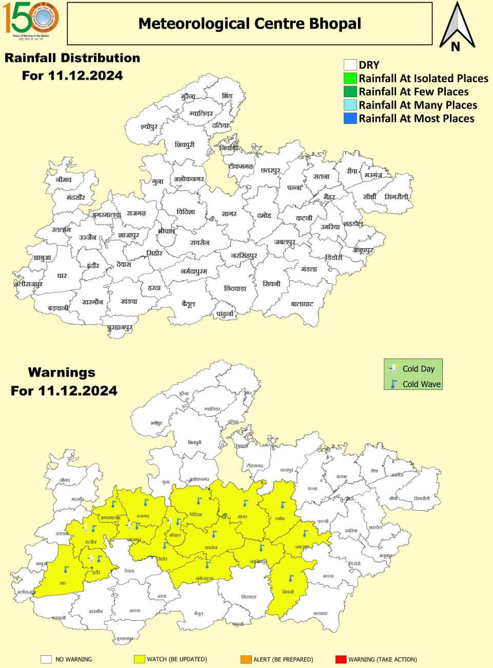 - भोपाल, राजगढ़, इंदौर, शाजापुर, उज्जैन, बैतूल, रायसेन और नीमच जिलों में कोल्ड डे।