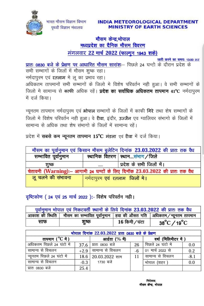 भोपाल, डेस्क रिपोर्ट। MP Weather Today. वर्तमान में कोई सिस्टम एक्टिव नहीं, जिसके चलते मौसम (MP Weather Update Today 22 March 2022) में बदलाव हो, हालांकि अगले 24 घंटे में पश्चिमी विक्षोभ के सक्रिय होने से तापमान में परिवर्तन देखा जा सकता है।पश्चिमी विक्षोभ की सक्रियता से 23 मार्च से मौसम में बदलाव आने का पूर्वानुमान है। एमपी मौसम विभाग (MP Weather Department) ने आज 22 मार्च 2022 मंगलवार को 2 जिलों में लू का अलर्ट जारी किया गया है और 16 किमी/ घंटा की रफ्तार से हवा चलने की संभावना जताई है।
