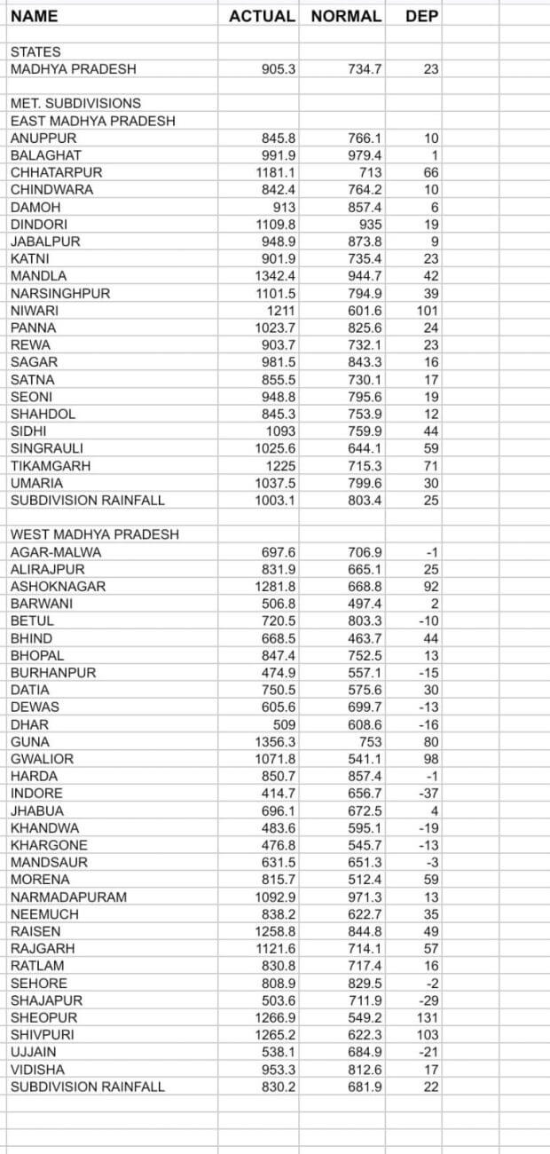 - मध्य प्रदेश में दीर्घावधि औसत से 23% अधिक वर्षा हुई है। पूर्वी मध्य प्रदेश में औसत से 25% और पश्चिमी मध्य प्रदेश 22% अधिक वर्षा हुई है। प्रदेश में अब तक औसत 35.6 इंच बारिश हो चुकी है। कोटा पूरा होने के लिए अब 1.4 इंच पानी की जरूरत है।