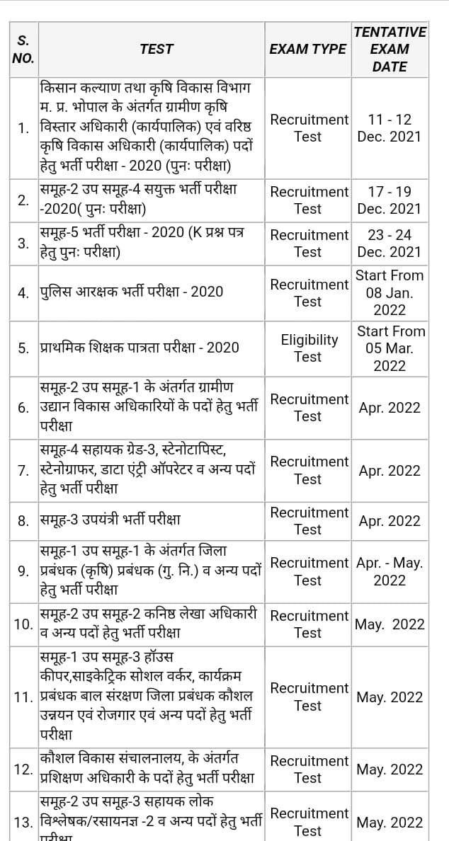 इसी प्रकार प्राथमिक शिक्षक पात्रता परीक्षा 2020 (MP TET 2020) अब 05 मार्च 2022 से शुरू होगी। MP TET का आयोजन पहले दिसंबर -2021- जनवरी 2022 के दौरान होने को प्रस्तावित था। हालांकि यह परीक्षा 1 मार्च 2021 को आयोजित की जानी थी लेकिन कोरोना को दृष्टिगत रखते हुए कई बार इस परीक्षा की तारीखों में बदलाव किया गया था। एमपी पुलिस कांस्टेबल भर्ती परीक्षा 2022 के महीने के लिए निर्धारित है।