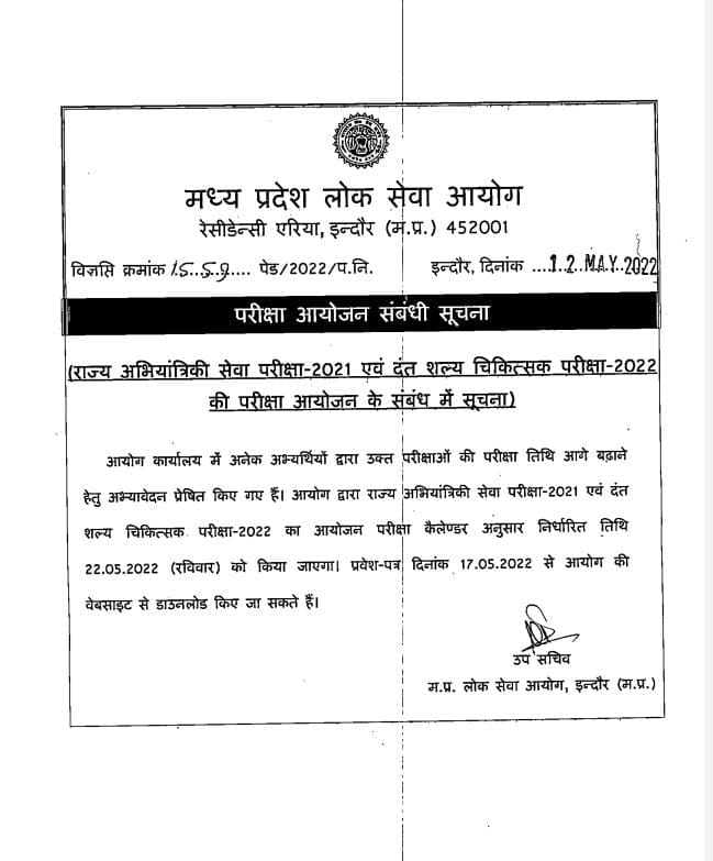 जारी नोटिफिकेशन के मुताबिक आयोग द्वारा राज्य अभियांत्रिकी सेवा परीक्षा 2001 की दन्त शल्य चिकित्सा परीक्षा 2022 का आयोजन परीक्षा कैलेंडर मुताबिक निर्धारित तिथि 22 मई 2022 रविवार के दिन किया जाएगा। इसके लिए एडमिट कार्ड 17 मई 2022 को आयोग की वेबसाइट पर अपलोड कर दिए जाएंगे।