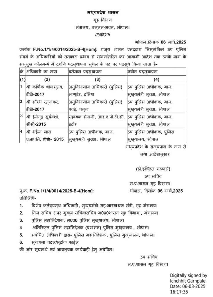 मध्य प्रदेश गृह विभाग ने सीएम की सुरक्षा में तैनात एक डीएसपी को हटाकर तीन नए डीएसपी की पोस्टिंग की है। गुरुवार को शासन द्वारा जारी आदेश में एसडीओपी भांडेर-दतिया कर्णिक श्रीवास्तव को उप पुलिस अधीक्षक मुख्यमंत्री सुरक्षा पदस्थ किया गया है। एसडीओपी पवई-पन्ना सौरभ रत्नाकर और सहायक सेनानी आर-एपीटीसी इंदौर हेमेंद्र सूर्यवंशी को भी उप पुलिस अधीक्षक मुख्यमंत्री सुरक्षा पदस्थ किया गया है।ये तीनों अधिकारी अभी अलग-अलग जिम्मेदारियों में थे, लेकिन अब इन्हें सीएम मोहन की सुरक्षा में तैनात किया गया है।
