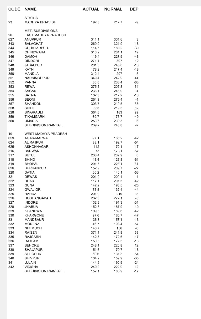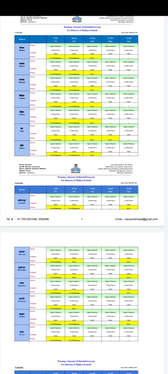 मौसम विभाग (MP Weather Alert) के अनुसार, आज 10 जुलाई 2021 शनिवार को सभी संभागों इंदौर, रीवा, उज्जैन, शहडोल, जबलपुर, होशंगाबाद, भोपाल, सागर, ग्वालियर-चंबल संभाग के जिलों में कहीं कहीं बौछार पड़ने की संभावना हैं। वही खरगोन, बड़वानी, बुरहानुपर, अनूपपुर, नीमच और झाबुआ में भारी बारिश के लिए येलो अलर्ट जारी किया गया है। इसके अलावा सभी संभागों में बिजली चमकने और गिरने के साथ 16 प्रति घंटा की रफ्तार से हवा चलने के भी आसार है। अब बंगाल की खाड़ी से सिस्टम बनने से भोपाल, इंदौर सहित पूरे प्रदेश में तेज बारिश होने के आसार है।