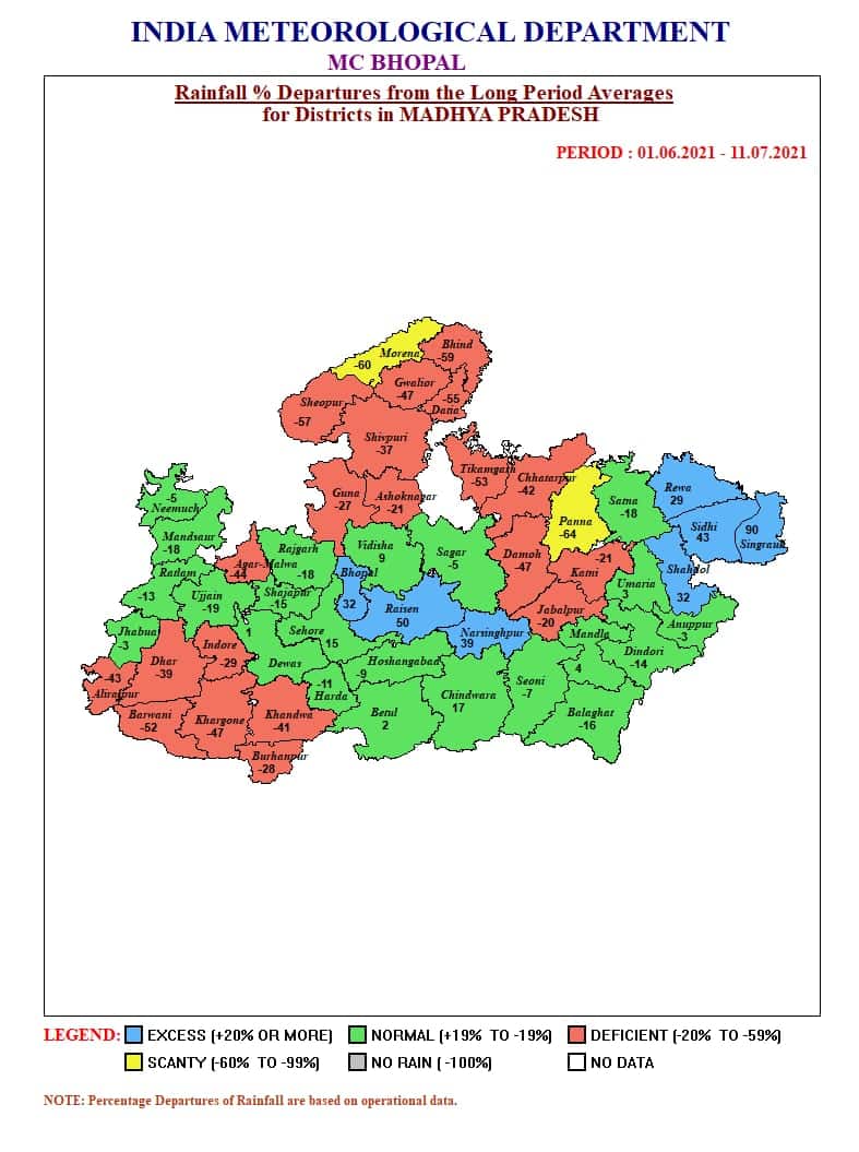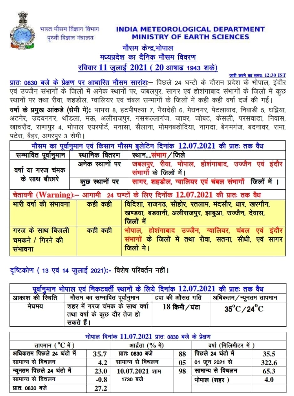 मौसम विभाग (MP Weather Alert) के अनुसार, आज रविवार 11 जुलाई 2021 को सभी संभागों इंदौर, रीवा, उज्जैन, शहडोल, जबलपुर, होशंगाबाद, भोपाल, सागर, ग्वालियर-चंबल संभाग के जिलों में कहीं कहीं बौछार पड़ने की संभावना हैं। वही विदिशा, राजगढ़, सीहोर, रतलाम, मंदसौर, धार, खरगोन, खंडवा, बड़वानी, अलीराजपुर, झाबुआ उज्जैन और देवास में भारी बारिश के लिए येलो अलर्ट जारी किया गया है। इसके अलावा इंदौर, उज्जैन, चंबल, होशंगाबाद, भोपाल, ग्वालियर-चंबल संभाग, रीवा, सतना, सीधी और सागर जिलों में बिजली चमकने और गिरने के साथ 18 प्रति घंटा की रफ्तार से हवा चलने के भी आसार है।