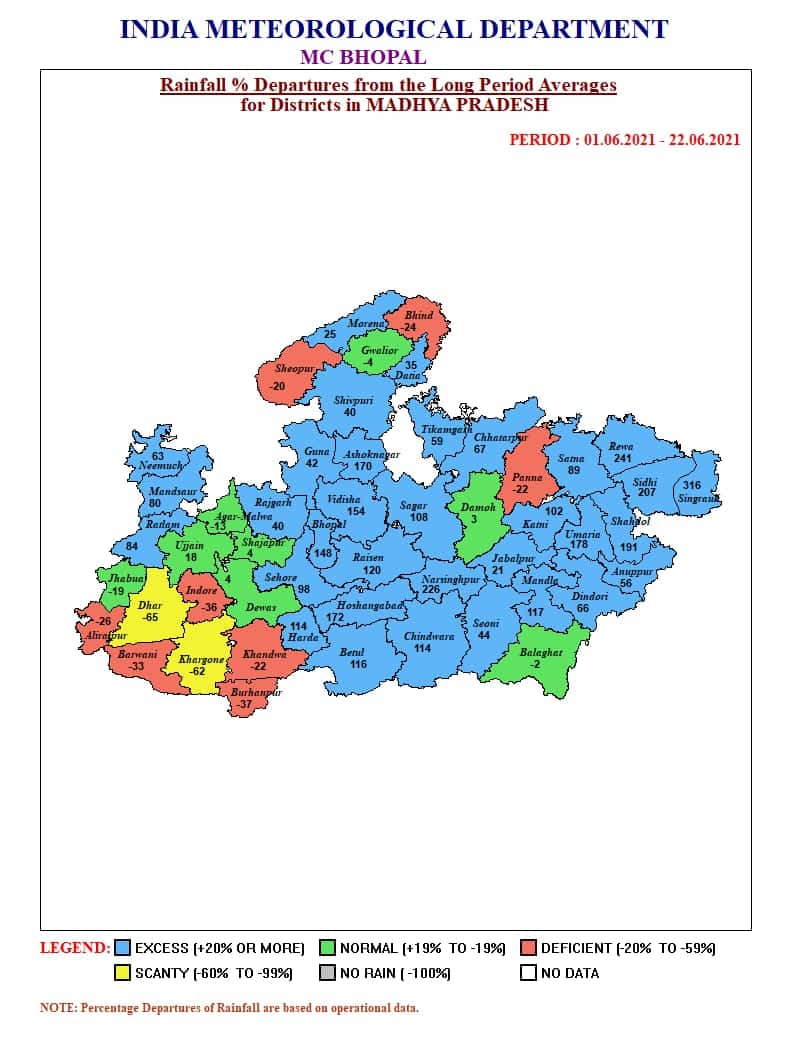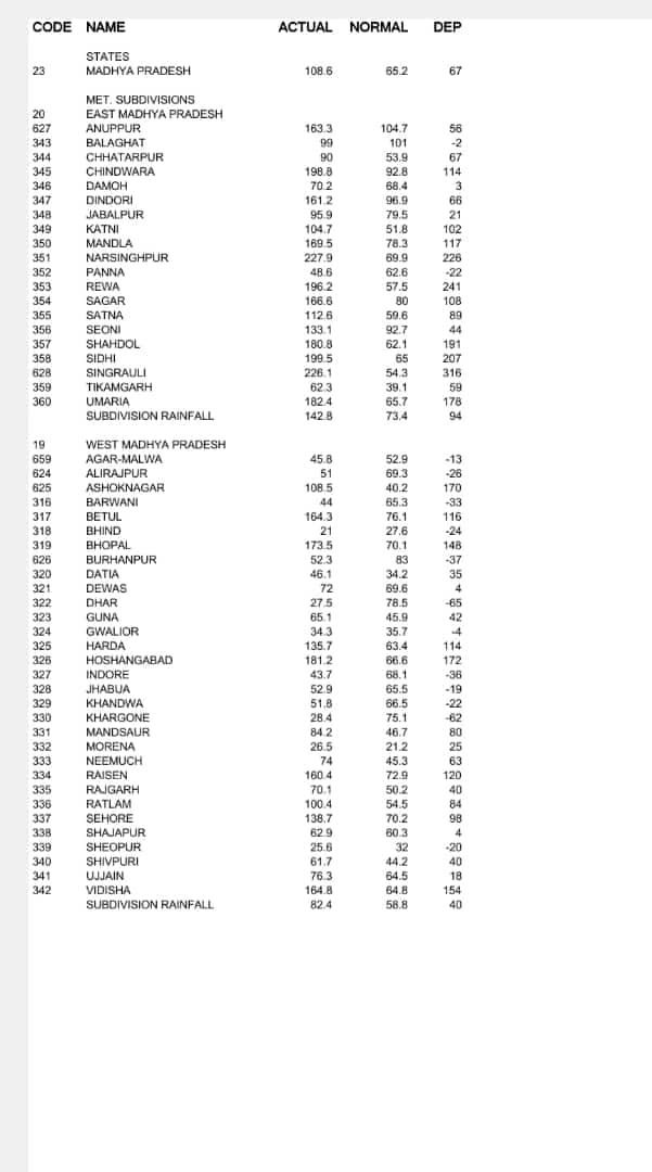 पिछले 24 घंटे में सतना में 39.0 एमएम, उज्जैन 2.0 एमएम, शाजापुर में 4.0 एमएम, खंडवा में 3.0 एमएम और गुना में बूंदाबांदी दर्ज की गई। सोमवार को राजधानी भोपाल का अधिकतम तापमान 33.5 डिग्री सेल्सियस दर्ज किया गया था, जो सामान्य से दो डिग्री कम है।