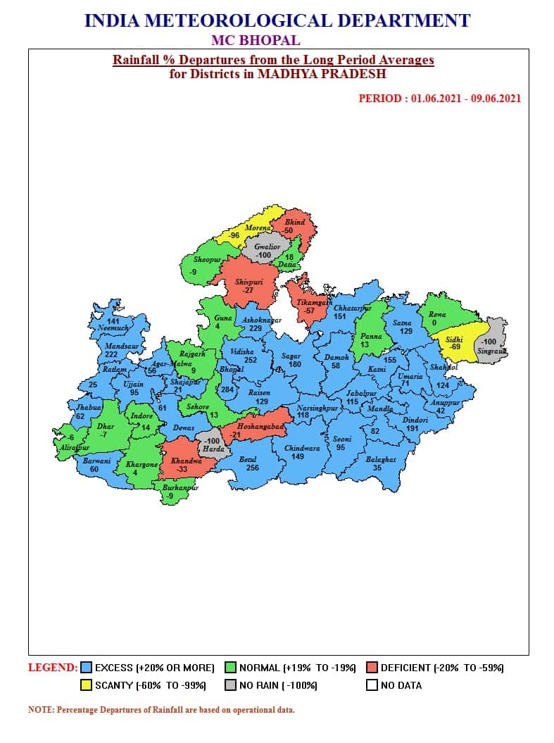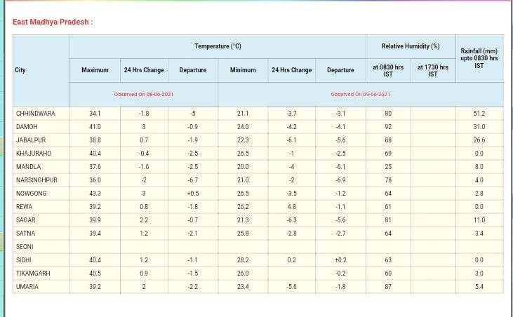 भोपाल, डेस्क रिपोर्ट। केरल से आगे बढ़ता हुआ मानसून मुंबई (Mumbai) पहुंच गया है। अरब सागर और बंगाल की खाड़ी (Bay of Bengal) में हलचल भी तेज हो गई है, ऐसे में मध्य प्रदेश में जारी प्री मानसून (Pre-Monsoon 2021) गतिविधियों में भी तेजी आई है। पिछले 24 घंटे में एक दर्जन से ज्यादा जिलों में आंधी के साथ झमाझम बारिश(Rain) हुई, जिसके चलते तापमान में गिरावट दर्ज की गई है। इसी कड़ी में मौसम विभाग (Weather Department) ने आज बुधवार 9 जून 2021 को 8 संभागों और 3 जिलों में बारिश की संभावना जताई है।