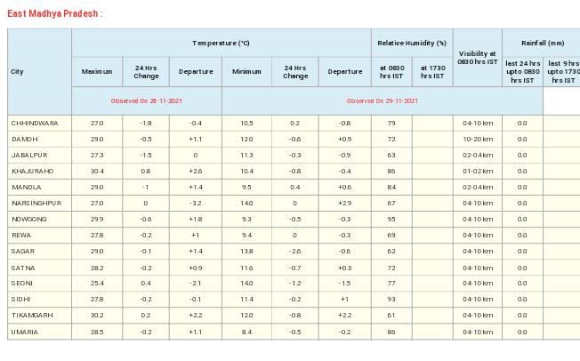 भोपाल, डेस्क रिपोर्ट। मध्य प्रदेश में दिसंबर में मौसम के मिजाज (MP Weather Change) बदलने वाले है।एक साथ कई सिस्टम बनने के चलते बारिश और ओलावृष्टि के आसार बन रहे है।इसका असर भोपाल-इंदौर के साथ ग्वालियर-चंबल संभाग में भी देखने को मिलेगा और फिर कड़ाके की ठंड पड़ेगी। वही तापमान में भी उतार-चढ़ाव के आसार है। एमपी मौसम विभाग (MP Weather Department) ने आज सोमवार 29 नवंबर 2021 को कहीं भी बारिश की संभावना नही जताई है यानि आज मौसम शुष्क रहने वाला है। वही हवाओं की रफ्तार भी 12 किमी/घंटा रहेगी।