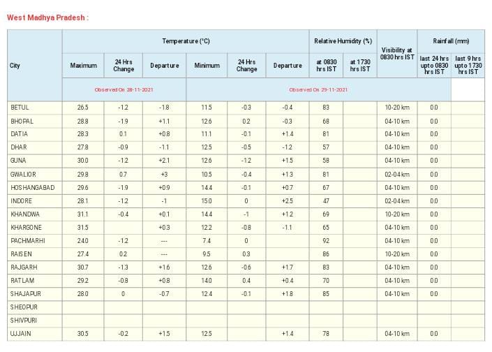 भारतीय मौसम विभाग (MP Weather Forecast) के अनुसार, पश्चिमी विक्षोभ के कारण 30 नवंबर की रात से पहाड़ों में बर्फबारी और उत्तर-पश्चिम राज्यों व मध्य भारत में बारिश की संभावना है। 30 नवंबर से 2 दिसंबर तक गुजरात, उत्तरी महाराष्ट्र और दक्षिण-पश्चिम मध्य प्रदेश और पूर्वी राजस्थान, हरियाणा, दक्षिण राजस्थान के आसपास के इलाकों में बारिश या गरज के साथ बौछार के आसार हैं।30 नवंबर से 2 दिसंबर तक गुजरात, उत्तरी महाराष्ट्र और दक्षिण-पश्चिम मध्य प्रदेश और दक्षिण राजस्थान के आसपास के इलाकों में भारी बारिश होने की संभावना है.