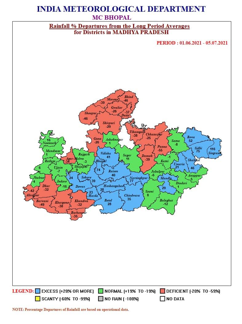 मौसम विभाग (MP Weather Update) के मुताबिक, वर्तमान में दक्षिण-पूर्वी राजस्थान पर हवा के ऊपरी भाग में एक चक्रवात बना हुआ है। इसके प्रभाव से उज्जैन, ग्वालियर, चंबल, जबलपुर, शहडाेल संभाग के जिलाें में कहीं-कहीं बरसात हाेने की संभावना है।।वही 7 जुलाई को बंगाल की खाड़ी में हवा के ऊपरी भाग में चक्रवात बनने की संभावना है, जिसके चलते 8 जुलाई के बाद प्रदेश में फिर झमाझम बारिश का सिलसिला शुरू हाेने के आसार हैं। विभाग ने किसान को भी सलाह दी है कि खरीफ फसल की बोवनी अभी 10 जुलाई तक न करें।