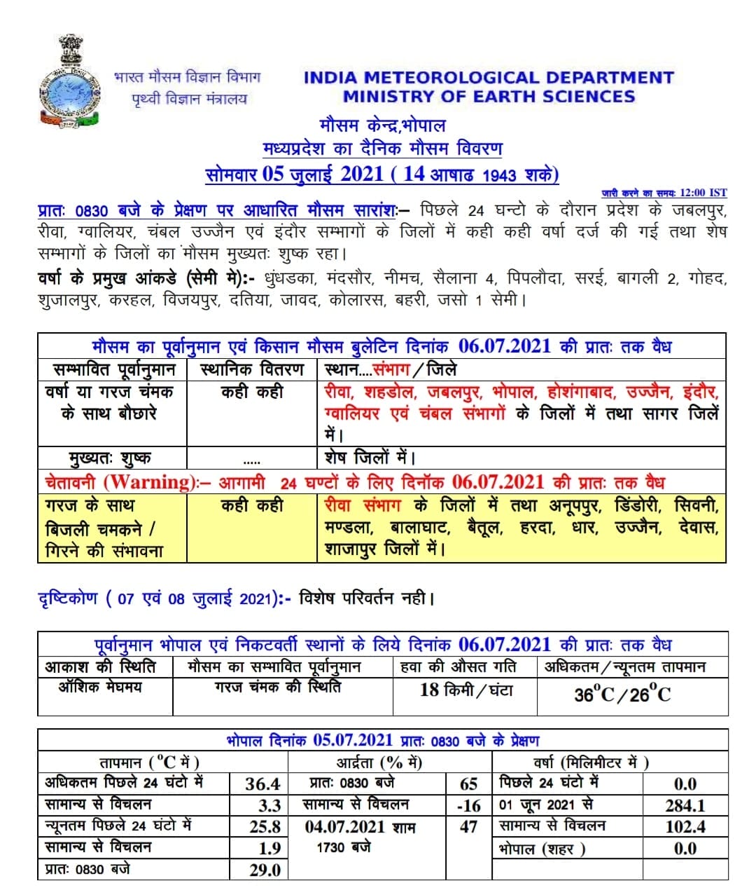 मौसम विभाग (MP Weather Alert) ने आज 5 जुलाई 2021 सोमवार को सागर संभाग को छोड़कर इंदौर, रीवा, उज्जैन, रीवा, शहडोल, जबलपुर, भोपाल, ग्वालियर और चंबल के साथ सागर जिले में कहीं कहीं बौछारों की संभावना जताई हैं। वही रीवा संभागों के जिलों के साथ अनूपपुर, डिंडौरी, सिवनी, मंडला, बालाघाट, बैतूल, हरदा, धार, उज्जैन, देवास, शाजापुर में बिजली चमकने और गिरने के साथ 18 प्रति घंटा की रफ्तार से हवा चलने के भी आसार है।