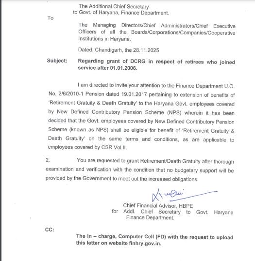 मुख्य सचिव और वित्त विभाग के अतिरिक्त मुख्य सचिव अनुराग रस्तोगी ने सभी बोर्ड-निगमों, सरकारी कंपनियों और सहकारी संस्थाओं के प्रबंध निदेशकों, मुख्य प्रशासकों और मुख्य कार्यकारी अधिकारियों को इस संबंध में पत्र भेजा गया है। निर्देश दिए गए हैं कि पात्र कर्मचारियों को यह लाभ निर्धारित नियमों के तहत उपलब्ध करवाना सुनिश्चित करें। आदेश में वर्ष 2017 की वित्त विभाग की अधिसूचना का हवाला देते हुए स्पष्ट किया गया है कि एनपीएस के अंतर्गत आने वाले राज्य सरकार के कर्मचारी उसी तरह रिटायरमेंट ग्रेच्युटी तथा डेथ ग्रेच्युटी प्राप्त करने के पात्र होंगे, जो सीएसआर वाल्यूम-2 के अंतर्गत कर्मचारियों को प्रदान किए जाते हैं।सभी अधिकारियों को निर्देश दिए गए हैं कि मामलों की पूरी जांच और सत्यापन के बाद ही रिटायरमेंट/डेथ ग्रेच्युटी प्रदान की जाए।