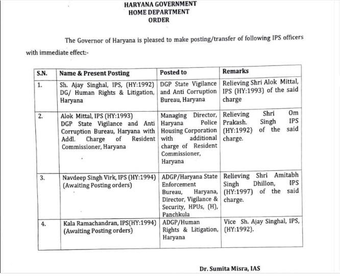 - आईपीएस नवदीप सिंह विर्क को एडीजीपी हरियाणा स्टेट इन्फोर्समेंट हरियाणा और आईपीएस अधिकारी कला रामचंद्रन को एडीजीपी ह्यूमन राइट एंड लिटिगेशन हरियाणा बनाया गया है।