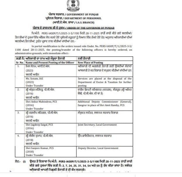 पंजाब सरकार ने सोमवार को एक IAS और तीन PCS अफ़सरों के तबादले व नई तैनातियों के आदेश जारी किए हैं। आईएएस अधिकारी सोनम (बैच 2023) आबकारी एवं कराधान विभाग के अधीन अपनी सेवाएं देंगी। विभाग में उनकी नई ज़िम्मेदारी जल्द तय होगी। अंकुर महिंदरू (PCS 2016) को एडीसी (जनरल), संगरूर ,जगदीप सैगल (PCS 2016) को संयुक्त सचिव, स्थानीय सरकार विभाग और संजय कुमार (PCS 2018) को डिप्टी डायरेक्टर, स्थानीय सरकार विभाग नियुक्त किया गया है।