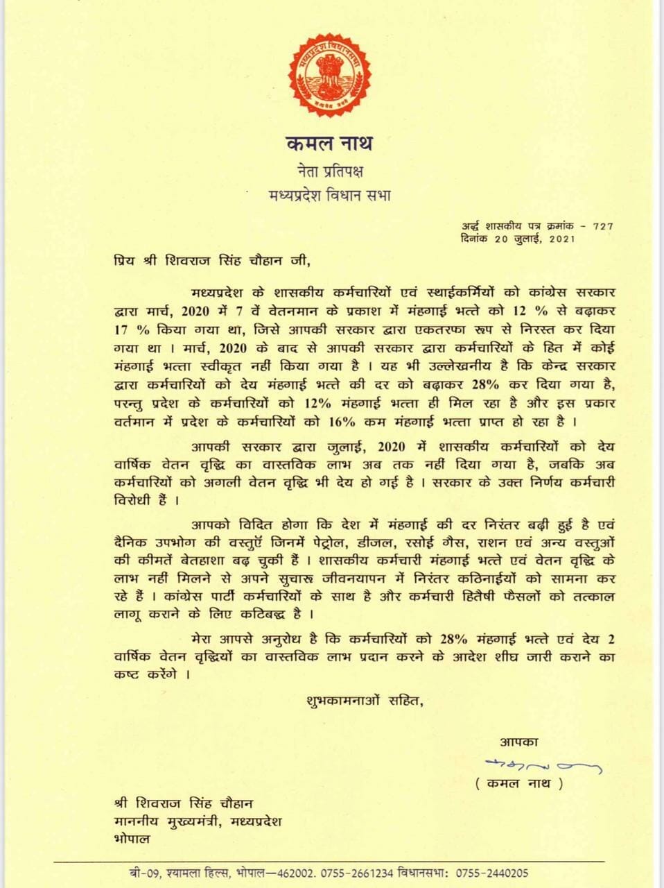 मध्य प्रदेश के पूर्व मुख्यमंत्री कमलनाथ ने सीएम शिवराज सिंह चौहान (CM Shivraj Singh Chouhan) को पत्र में लिखा है कि केंद्र सरकार द्वारा सरकारी कर्मचारियों को महंगाई भत्ता 28 प्रतिशत दिया जा रहा है, जबकि प्रदेश के सरकारी कर्मचारियों को महंगाई भत्ता अभी भी 12 प्रतिशत ही दिया जा रहा है। यानि प्रदेश के सरकारी कर्मचारियों को केंद्र सरकार के कर्मचारियों की अपेक्षा 16 प्रतिशत कम महंगाई भत्ता मिल रहा है, इसलिए हमारी सरकार से मांग है कि प्रदेश के कर्मचारियों को भी केंद्र के समान ही डीए दिया जाए।