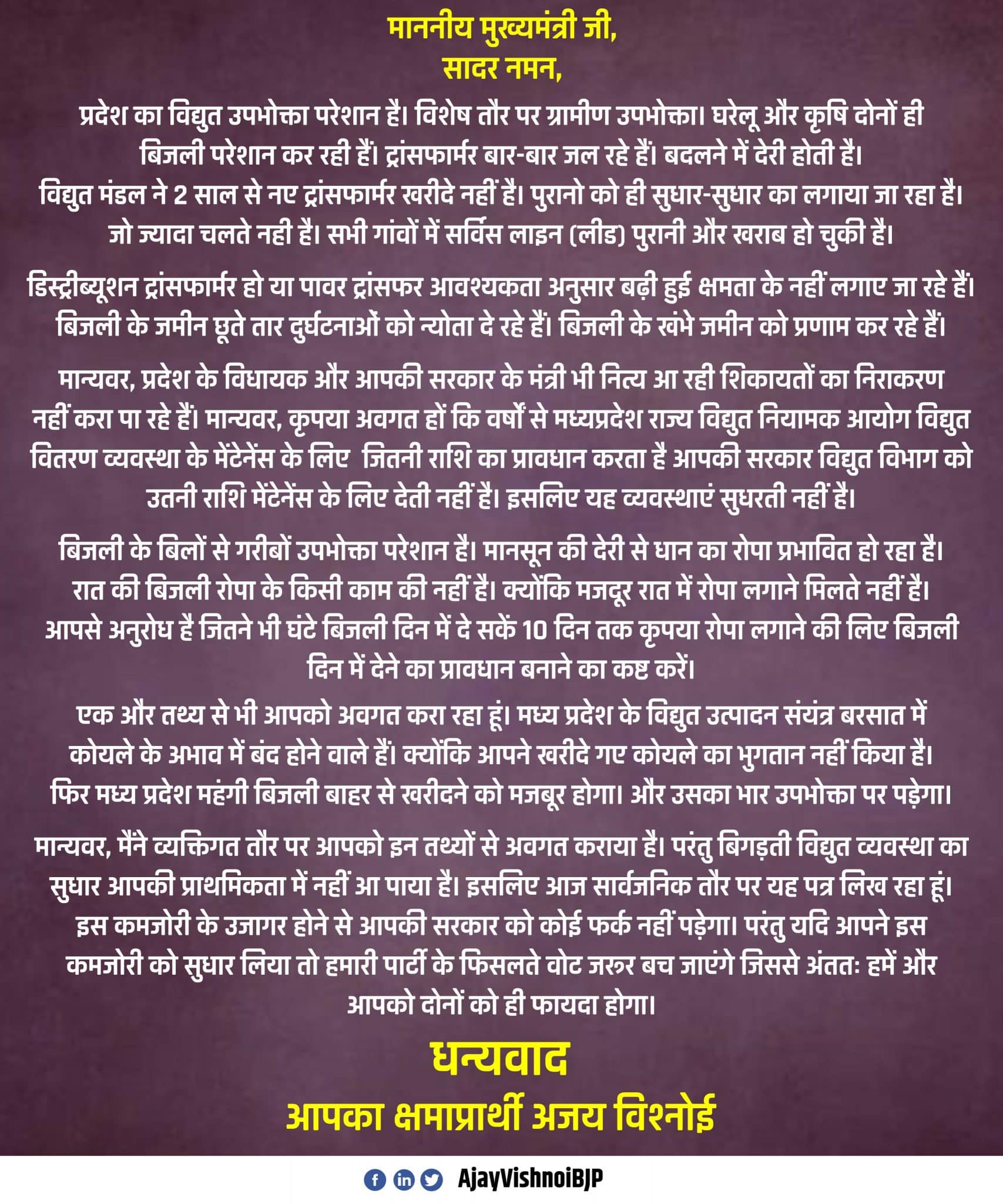 भाजपा विधायक अजय विश्नोई ने ट्वीट कर लिखा है कि मुख्यमंत्री शिवराज सिंह चौहान (Shivraj Singh Chouhan) जी मध्य प्रदेश का विद्युत उपभोक्ता (electricity customer) परेशान है। विशेषतौर पर ग्रामीण उपभोक्ता। घरेलू और कृषि दोनों ही बिजली (electricity) परेशान कर रही हैं। ट्रांसफार्मर (Transformer) बार-बार जल रहे हैं।बदलने में देरी होती है। विद्युत मंडल ने 2 साल से नए ट्रांसफार्मर खरीदे नहीं है, बल्कि उन्हें ही सुधार कर लगाया जा रहा है।बिजली के जमीन छूते तार दुर्घनाओं को न्यौता दे रहे है।