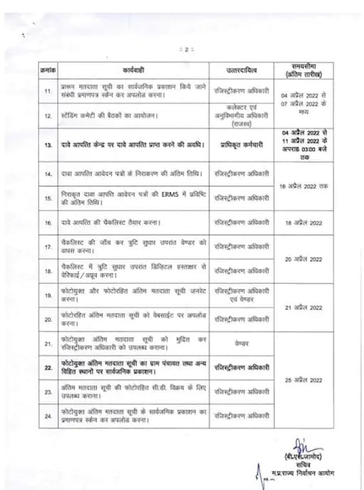 जारी निर्देश के मुताबिक 25 अप्रैल तक पंचायत के चुनाव नहीं होंगे। राज्य निर्वाचन आयोग द्वारा नए परिसीमन (new delimitation) के आधार पर वोटर लिस्ट (voter list) तैयार करने के निर्देश दिए गए हैं। जिसके लिए प्रक्रिया 16 मार्च से शुरू की जाएगी। 16 मार्च तक वोटर लिस्ट अपडेट होने का काम किया जाएगा। इसके बाद 4 अप्रैल से लेकर 16 अप्रैल तक इसके लिए दावे और आपत्तियां आमंत्रित किए गए। जबकि 25 अप्रैल को नए वोटर लिस्ट के फाइनल प्रकाशन किए जाएंगे। ऐसे में अब फाइनल वोटर लिस्ट तैयार होने के बाद ही मध्य प्रदेश में पंचायती चुनाव आयोजित हो सकेंगे।