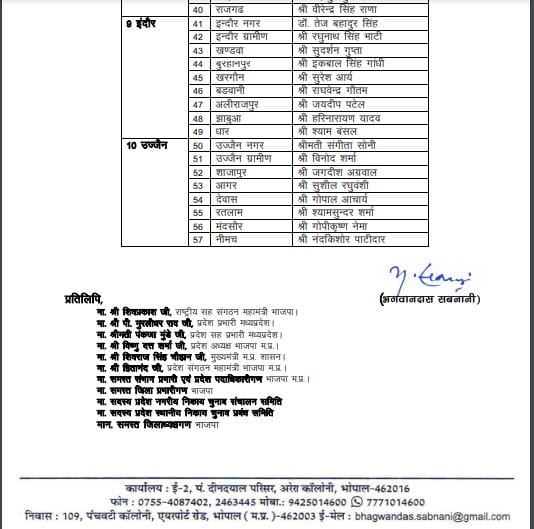 भोपाल, डेस्क रिपोर्ट। मध्यप्रदेश में आगामी दिनों मे होने वाले नगरीय निकाय चुनाव को लेकर बीजेपी की तैयारिया जोरों पर चल रही है। नगरीय निकाय चुनाव के लिए नगर पालिका चुनाव प्रभारियों की घोषणा के बाद अब जिला चयन समिति घोषित की गई है जो संगठन के जिला प्रभारी के संयोजकत्व टीम में काम करेगी।