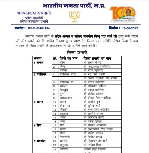 भोपाल, डेस्क रिपोर्ट। मध्यप्रदेश में आगामी दिनों मे होने वाले नगरीय निकाय चुनाव को लेकर बीजेपी की तैयारिया जोरों पर चल रही है। नगरीय निकाय चुनाव के लिए नगर पालिका चुनाव प्रभारियों की घोषणा के बाद अब जिला चयन समिति घोषित की गई है जो संगठन के जिला प्रभारी के संयोजकत्व टीम में काम करेगी।