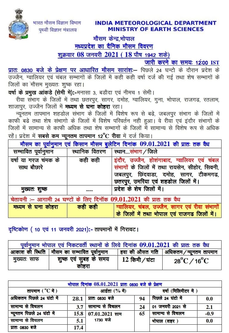 भारतीय मौसम विभाग (IMD) के अनुसार, अगले 24 घंटे में मध्य प्रदेश, महाराष्ट्र, कर्नाटक, गोवा, केरल, तमिलनाडु में भारी वर्षा होने की संभावना है। मध्‍य प्रदेश और महाराष्‍ट्र राज्‍यों के इंदौर, भोपाल एवं नागपुर, अकोला, पुणे, सांगली, कोल्‍हापुर, सतारा, लातूर एवं परभणी आदि शहरों में बारिश देखी जा सकती है। इस बेमौसम बरसात के साथ एक-दो स्थानों पर ओलावृष्टि की भी संभावना है। जम्मू कश्मीर, हिमाचल, उत्तराखंड में हल्की से मध्यम वर्षा व बर्फबारी जारी रहेगी। ।