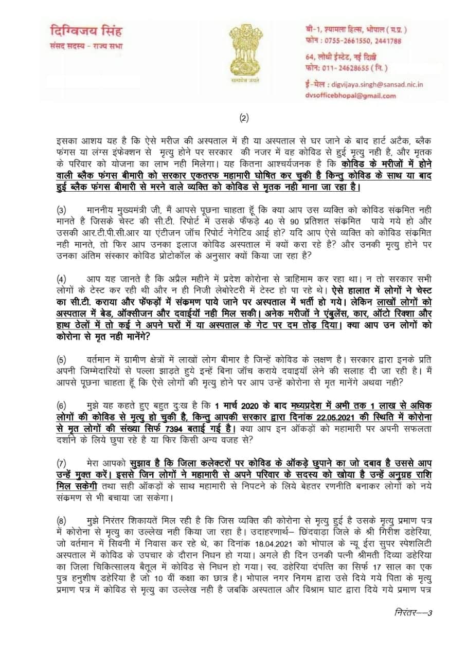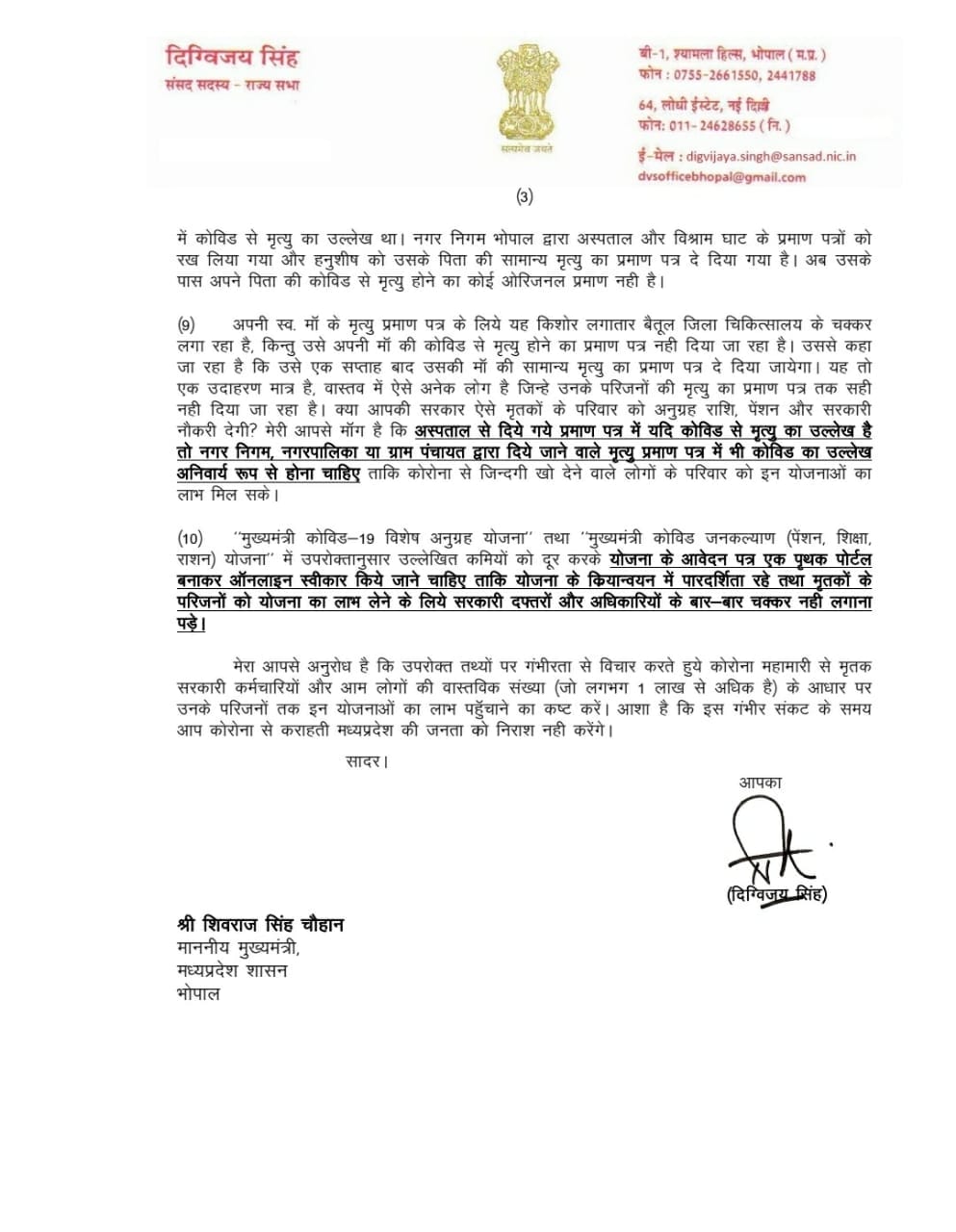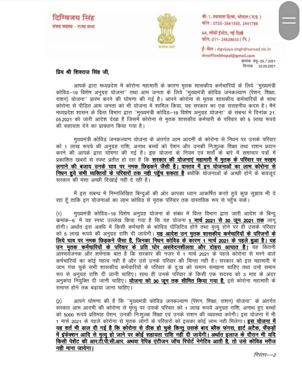 दिग्विजय सिंह ने अपने पत्र में लखा है कि “आपके द्वारा मध्यप्रदेश में कोरोना महामारी के कारण मृतक शासकीय कर्मचारियों के लिये ‘‘मुख्यमंत्री कोविड-19 विशेष अनुग्रह योजना’’ तथा आम जनता के लिये ‘‘मुख्यमंत्री कोविड जनकल्याण (पेंशन, शिक्षा, राशन) योजना’’ प्रारंभ करने की घोषणा की गई है। आपने कोरोना से मृतक शासकीय कर्मचारियों के साथ कोरोना से पीड़ित आम जनता को भी योजना में शामिल किया, यह सरकार का एक सराहनीय कदम है। मैने मध्यप्रदेश शासन के वित्त विभाग द्वारा ‘‘मुख्यमंत्री कोविड-19 विशेष अनुग्रह योजना’’ के संबन्ध में दिनांक 21.05.2021 को जारी आदेश देखा है जिसमें कोरोना से मृतक शासकीय कर्मचारी के परिवार को 5 लाख रूपये की सहायता देने का प्रावधान किया गया है।”
