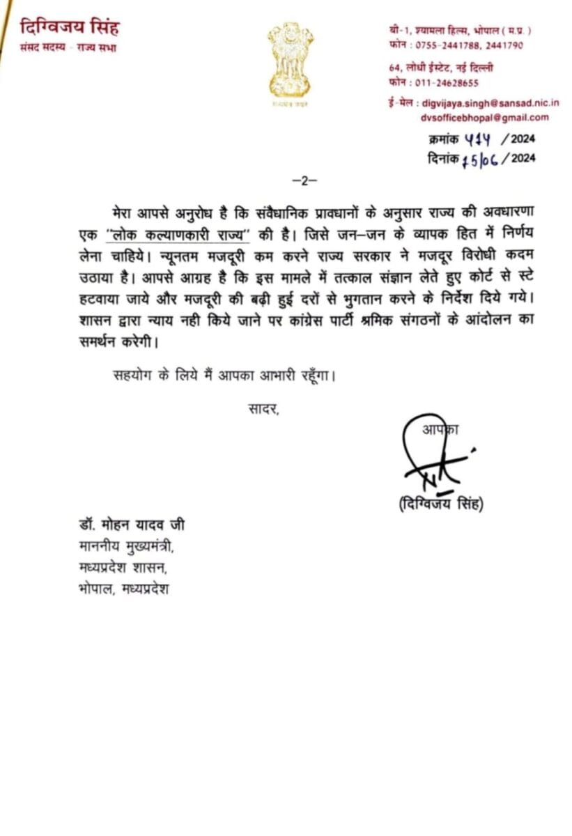 ‘दस साल बाद मिला न्याय एक माह भी खुशियां नही दे सका और श्रम विभाग की अधिसूचना के विरोध में औद्योगिक संगठनों ने कोर्ट में याचिका दायर कर स्टे ले लिया। पूरे प्रदेश के श्रमिकों, कामगारों की मजदूरी मई 2024 से पुनः कम होकर पुरानी दरों पर आ गई। इस पूरे प्रकरण में राज्य शासन का रवैया श्रमिक विरोधी प्रतीत होता है। उसकी तरफ से न हाईकोर्ट से स्टे हटवाने के गंभीरता से प्रयास किये गये न ही सुप्रीम कोर्ट में स्टे के खिलाफ याचिका लगाई गई। यही नहीं श्रम आयुक्त ने 2014 की दरों से भुगतान करने का आदेश जारी कर श्रमिकों के हितों पर कुठाराघात किया है। मेरा आपसे अनुरोध है कि संवैधानिक प्रावधानों के अनुसार राज्य की अवधारणा एक ‘‘लोक कल्याणकारी राज्य’’ की है जिसे जन-जन के व्यापक हित में निर्णय लेना चाहिये। न्यूनतम मजदूरी कम करने राज्य सरकार ने मजदूर विरोधी कदम उठाया है। आपसे आग्रह है कि इस मामले में तत्काल संज्ञान लेते हुए कोर्ट से स्टे हटवाया जाये और मजदूरी की बढ़ी हुई दरों से भुगतान करने के निर्देश दिये जाएं। शासन द्वारा न्याय नही किये जाने पर कांग्रेस पार्टी श्रमिक संगठनों के आंदोलन का समर्थन करेगी। सहयोग के लिये मैं आपका आभारी रहूँगा’।