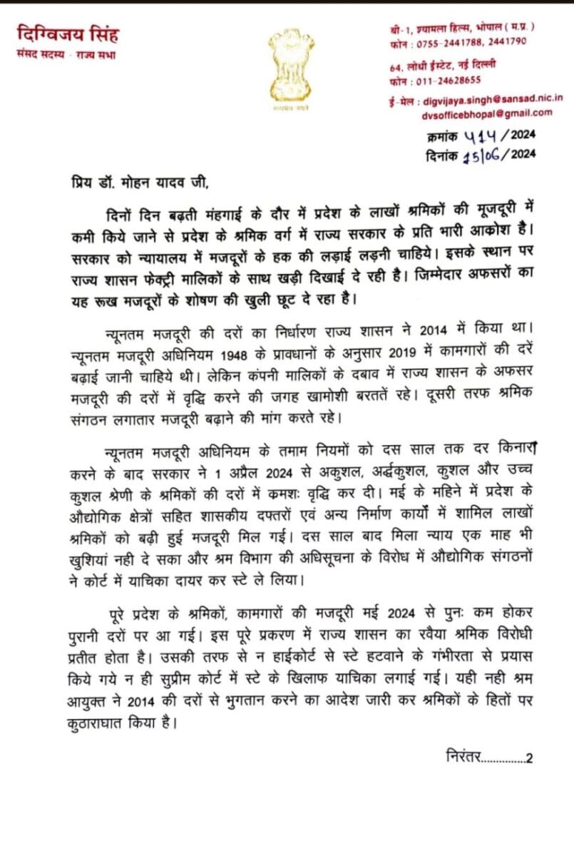 Digvijaya Singh wrote a letter to CM : पूर्व मुख्यमंत्री दिग्विजय सिंह ने सीएम डॉ मोहन यादव को पत्र लिखा है। इसमें उन्होंने श्रमिकों की दरों में वृद्धि के एक माह बाद ही औद्योगिक संगठनों द्वारा कोर्ट में याचिका दायर कर स्टे लेने को लेकर विरोध जताया है और कहा है कि सरकार मज़दूरों के हित में शीघ्र कोई निर्णय लें।