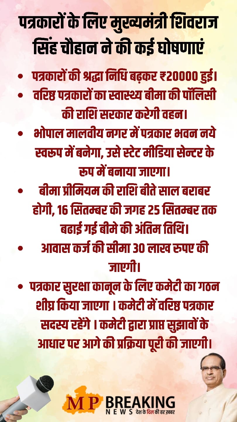 राजधानी भोपाल में मुख्यमंत्री शिवराज सिंह चौहान ने प्रदेश में पत्रकारिता को मजबूती देने और इसे सुदृढ़ करने के लिए पत्रकारों के हित में कई अन्य घोषणा की है। पत्रकार सुरक्षा कानून के लिए कमेटी का निर्माण किया जाएगा। पत्रकार भवन का निर्माण कर स्टेट मीडिया सेंटर का निर्माण किया जाएगा। आवास कर्ज की सीमा को 30 लाख तक बढ़ाया जाएगा। उनके सम्मान निधि को बढ़ाकर 20000 रुपए किया गया है।