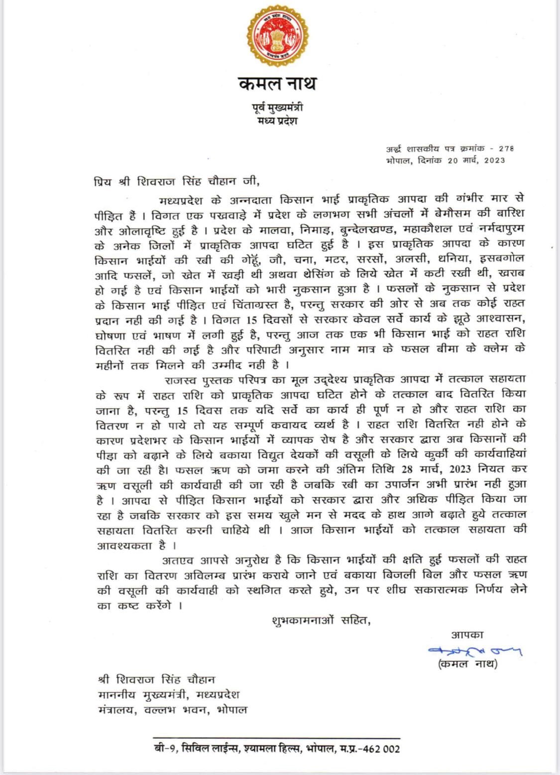 कमलनाथ ने अपने पत्र मं लिखा है कि ‘प्रदेश के मालवा निमाड़ बुंदेलखंड महाकौशल एवं नर्मदा पुरम के अनेक जिलों में प्राकृतिक आपदा घटित हुई है। पिछले 15 दिन से सरकार सिर्फ सर्वे कराने की बात कह रही है और अब तक एक भी किसान को राहत राशि नहीं मिली है। रबी की गेहूं जौ चना मटर सरसों अलसी धनिया ईसबगोल आदि की फसलें या तो खेत में खड़ी थी या थ्रेसिंग के लिए खेत में कटी रखी थी। यह फसलें ओलावृष्टि और अतिवृष्टि से खराब हो गई हैं। राजस्व पुस्तक परिपत्र का मूल उद्देश्य प्राकृतिक आपदा में तत्काल सहायता के रूप में राहत राशि को प्राकृतिक आपदा घटित होने के तत्काल बाद वितरित किया जाना है। परन्तु यदि 15 दिवस तक सर्वे कार्य ही पूर्ण न हो पाए तो सम्पूर्ण कवायद व्यर्थ है। राहत राशि वितरित नहीं होने के कारण प्रदेशभर के किसान भाईयों में रोष है और सरकार द्वारा अब किसानों की पीड़ा को बढ़ाने के लिए बकाया विद्युत देयकों की वसूली के लिए कुर्की कार्यवाहियां की जा रही है। फसल ऋण को जमा करने की अंतिम तिथि 28 मार्च नियत कर दी गई है। आपदा से पीड़ित किसान भाईयों को सरकार द्वारा और अधिक पीड़ित किया जा रहा है। अतएव आपसे अनुरोध है कि किसान भाईयों की क्षति हुई फसलों की राहत राशि का वितरण अविलंब प्रारंभ कराया जाए।’