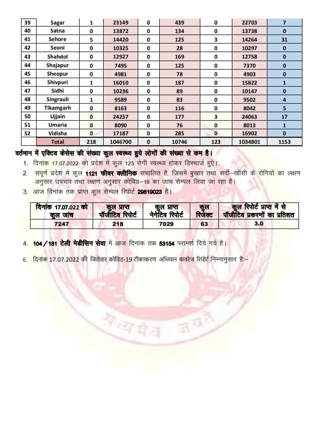 स्वास्थ्य विभाग द्वारा जारी बुलेटिन के अनुसार, रविवार को प्रदेशभर में 7,247 सेम्पलों की जांच में 218 पॉजिटिव और 7,029 सेम्पल निगेटिव पाए गए, जबकि 63 सेम्पल रिजेक्ट हुए। संक्रमण की दर 3.0 रही। नये मामलों में इंदौर में 115, भोपाल में 35, जबलपुर में 27, खंडवा में 11, नर्मदापुरम में 6, सीहोर में 5, ग्वालियर और खरगोन में 3-3, बैतूल और कटनी में 2-2 तथा दतिया, हरदा, मंडला, निवाड़ी, रायसेन, राजगढ़, सागर, शिवपुरी और सिंगरौली में 1-1 नये संक्रमित मिले।इसके साथ ही 33 जिलों में कोरोना के नये मामले शून्य रहे और कोरोना से कोई मौत नहीं हुई।