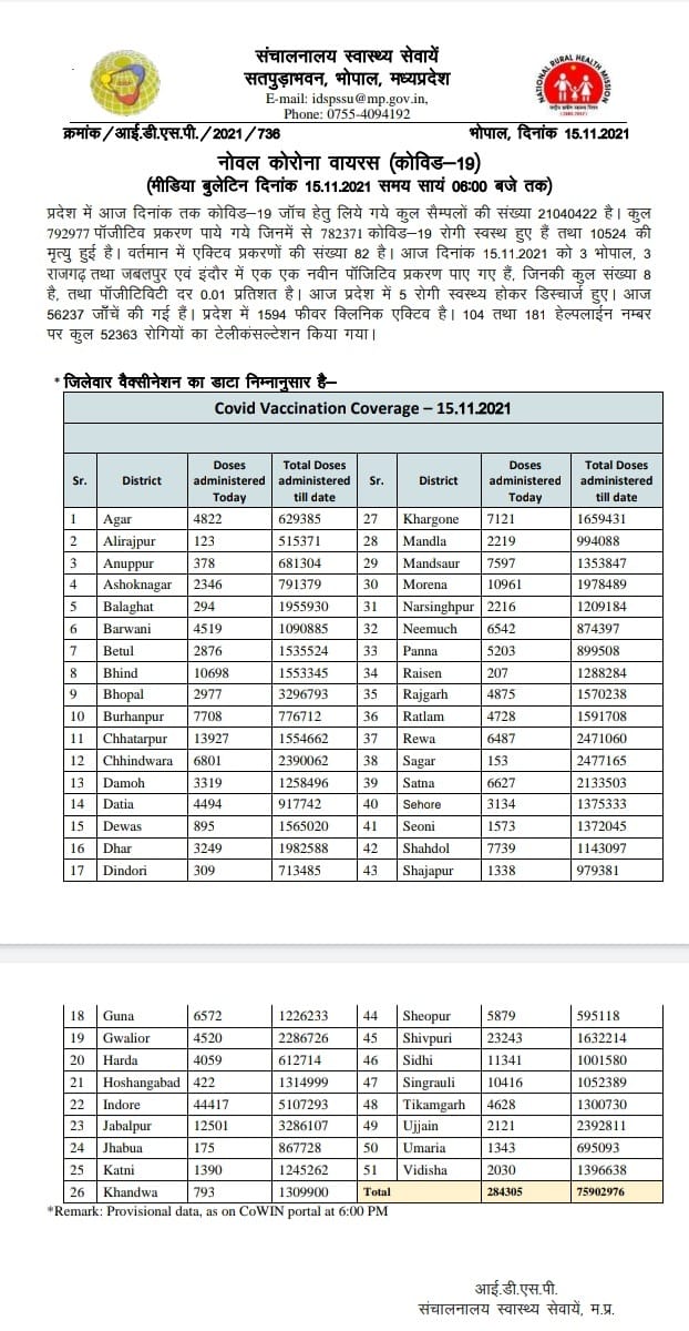इस दौरान 56237 जांचे की गई है और 1594 फीवर क्लिनिक एक्टिव है। इसके पहले 14 नवंबर को 13, 13 नवंबर को 11 केस, 12 नंवबर को 9 केस, 11 नंवबर को 12 केस, 10 नवंबर को 5 केस, 9 को 9, 8 और 7 नवंबर को 6-6 कोरोना पॉजिटिव सामने आए थे।अच्छी बात ये है कि देश में गर्भवती महिलाओं को कोविड वैक्सीन लगाने में मध्यप्रदेश (Madhya Pradesh Corona Vaccination) अव्वल आया है। 4 लाख से अधिक गर्भवती महिलाओं को वैक्सीन के दोनों डोज लगे है।