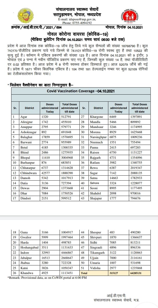 इतना ही नहीं प्रदेश में पांच दिनों में 11 जिलों में 51 नए संक्रमित हुए हैं। इसमें सबसे ज्यादा इंदौर में 18, भोपाल में 11, खंडवा में 6, जबलपुर, शिवपुरी और बालाघाट 3-3, पन्ना-सागर में 2-2 एवं रतलाम, शहडोल, छतरपुर में 1-1 संक्रमित मिला है।गृह मंत्री नरोत्तम मिश्रा ने बताया कि प्रदेश में कोरोना संक्रमण नियंत्रण में है। पिछले 24 घंटे में कोरोना के सिर्फ 10 नए केस आए हैं जिसमें 6 भोपाल के हैं जबकि 4 लोग स्वस्थ होकर घर गए हैं। प्रदेश में कोरोना संक्रमण दर मात्र 0.02 फीसदी बची है जबकि रिकवरी रेट 98.60% है। प्रदेश में कल कोरोना के 52,265 टेस्ट हुए है।
