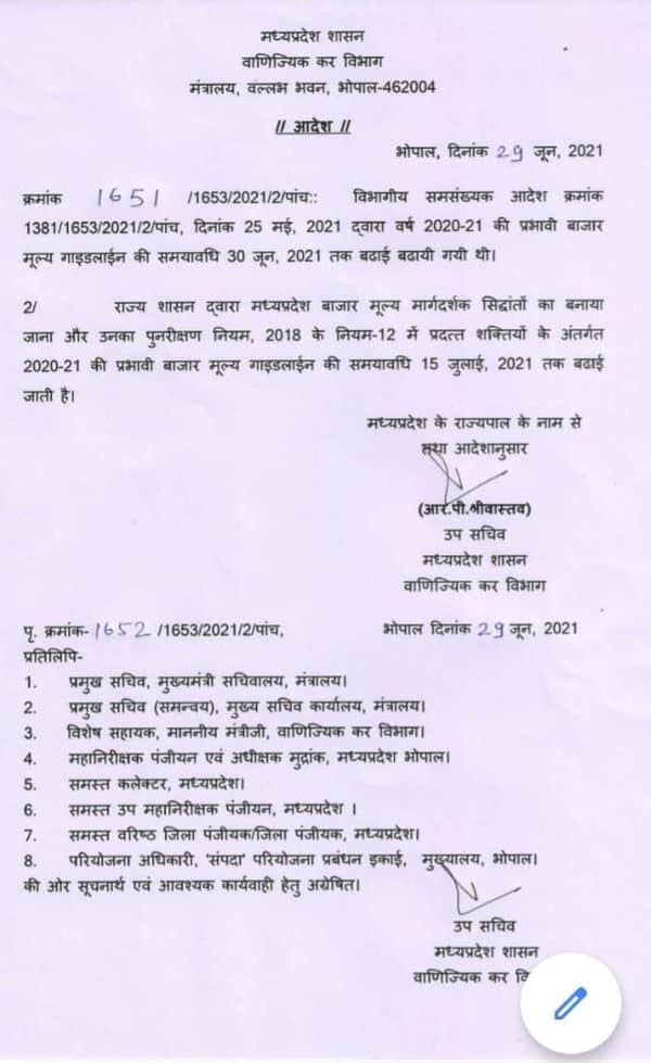 राज्य शासन ने वर्ष 2020-21 की प्रभावी बाजार मूल्य गाइडलाइन की अवधि 30 जून से बढ़ा कर 15 जुलाई 2021 कर दी गई है। वाणिज्यिक कर विभाग ने इस संबंध में आदेश जारी कर दिये हैं।शासन द्वारा मध्यप्रदेश बाजार मूल्य मार्गदर्शक सिद्वातों के पुनरीक्षण नियम 2018 के नियम-12 में प्रदत्त शक्तियों के अर्तगत 2020-21 की प्रभावी बाजार मूल्य गाइडलाईन की समयावधि 15 जुलाई 2021 तक बढ़ाई गई है।