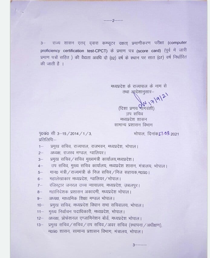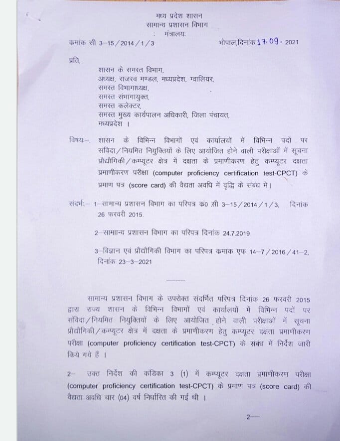 भोपाल, डेस्क रिपोर्ट। मध्य प्रदेश (MP) में शिवराज सरकार (shivraj government) द्वारा युवाओं सहित संविदा और नियमित नियुक्तियों में शामिल होने वाले पात्रों के लिए बड़ी घोषणा की गई है। इसके लिए सामान्य प्रशासन विभाग (General Administration Department) द्वारा आदेश जारी कर दिए गए हैं। दरअसल कंप्यूटर दक्षता प्रमाणीकरण परीक्षा के प्रमाण पत्र की वैधता अवधि को लेकर नए आदेश जारी किए गए हैं आदेश अनुसार CPCT स्कोर कार्ड (CPCT Scorecard) की वैधता (validity) को 2 साल से बढ़ाकर 7 साल कर दिया गया है