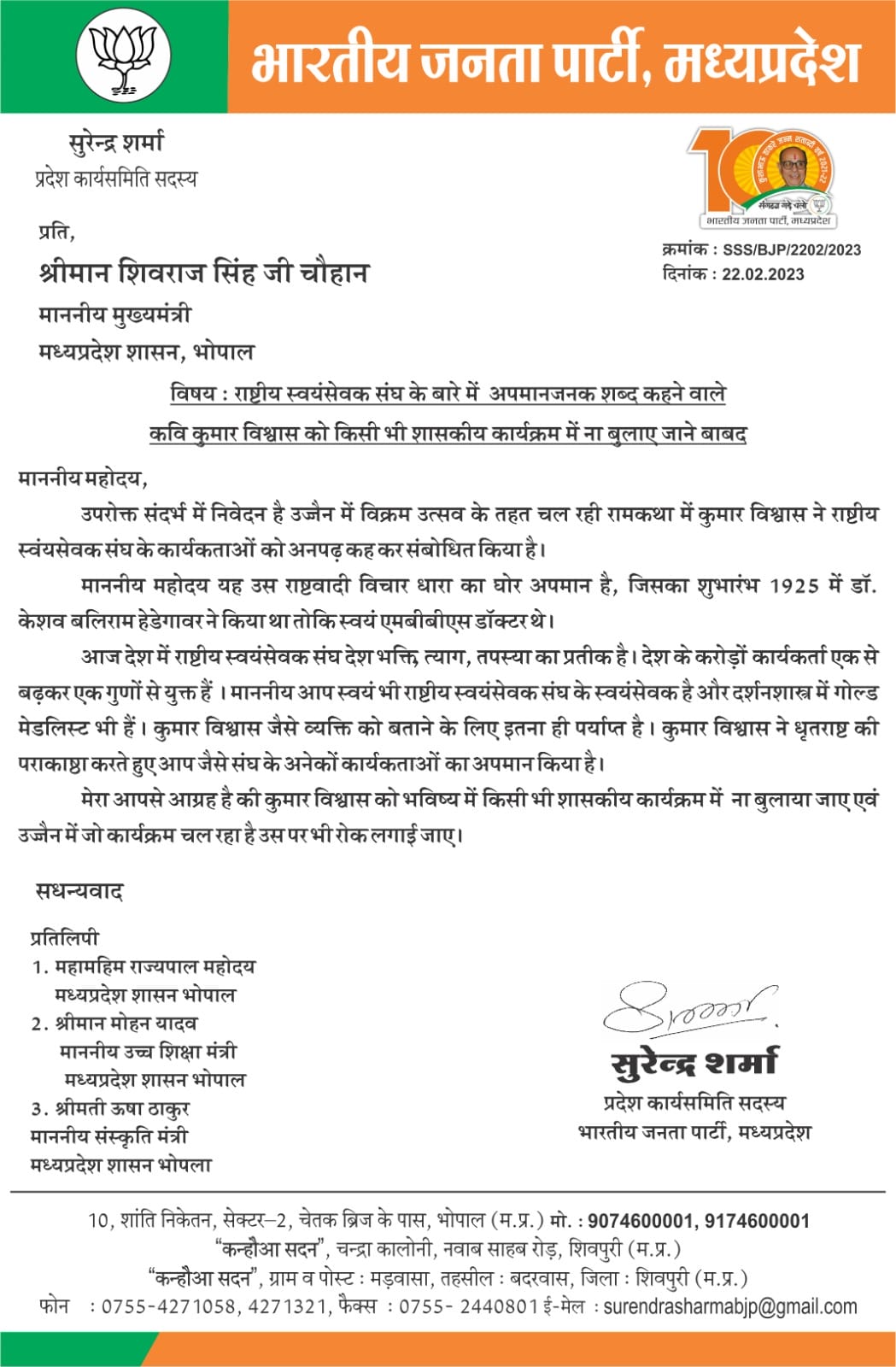 इसे लेकर अब बीजेपी नेता ने मुख्यमंत्री को पत्र लिखा है कि ‘उज्जैन में विक्रम उत्सव के तहत चल रही रामकथा में कुमार विश्वास ने राष्ट्रीय स्वयंसेवक संघ के कार्यकर्ताओं को अनपढ़ कह कर संबोधित किया है, माननीय महोदय यह उस राष्ट्रवादी विद्वत विचारधारा का अपमान है जिसका शुभारंभ 1925 में डॉ केशव बलिराम हेडगेवार जो स्वयं एमबीबीएस डॉक्टर थे ने किया था। आज देश में राष्ट्रीय स्वयंसेवक संघ देश भक्ति त्याग तपस्या का प्रतीक है देश की करोड़ों कार्यकर्ता एक से बढ़कर एक गुणों से युक्त हैं माननीय आप स्वयं राष्ट्रीय स्वयं सेवक संघ के स्वयंसेवक हैं और दर्शनशास्त्र में गोल्ड मेडलिस्ट हैं कुमार विश्वास जैसे व्यक्ति को बताने के लिए इतना ही पर्याप्त है। कुमार विश्वास ने धृष्टता की पराकाष्ठा करते हुए आप जैसे सभी कार्यकर्ताओं का अपमान किया है। मेरा आपसे आग्रह है की कुमार विश्वास को भविष्य में किसी भी शासकीय कार्यक्रम में ना बुलाया जाए एवं उज्जैन में जो कार्यक्रम चल रहा है उस पर रोक लगाई जाये।’ उन्होने इस पत्र की प्रतिलिपि महामहिम राज्यपाल, उच्च शिक्षा मंत्री और संस्कृति मंत्री को भी भेजी है।