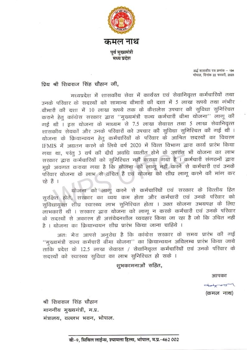अपने पत्र में कमलनाथ ने लिखा है कि ‘मध्यप्रदेश में शासकीय सेवा में कार्यरत एवं सेवानिवृत्त कर्मचारियों तथा उनके परिवार के सदस्यों को सामान्य बीमारी की दशा में 5 लाख रुपये तथा गंभीर बीमारी की दशा में 10 लाख रूपये तक के कैशलेस उपचार की सुविधा सुनिश्चित कराने हेतु कांग्रेस सरकार द्वारा ‘‘मुख्यमंत्री राज्य कर्मचारी बीमा योजना लागू की गई थी। इस योजना के माध्यम से 7.5 लाख सेवारत तथा 5 लाख सेवानिवृत्त शासकीय सेवकों और उनके परिवारों को उपचार की सुविधा सुनिश्चित की गई थी। योजना के क्रियान्वयन हेतु कर्मचारियों के परिवार के आश्रित सदस्यों का विवरण प्थ्डप्ै में अद्यतन करने के लिये वर्ष 2020 में वित्त विभाग द्वारा कार्य प्रारंभ किया गया था, परंतु 3 वर्ष की दीर्घ अवधि व्यतीत होने के उपरांत भी योजना का लाभ मप्र सरकार द्वारा कर्मचारियों को सुनिश्चित नहीं कराया गया है।’