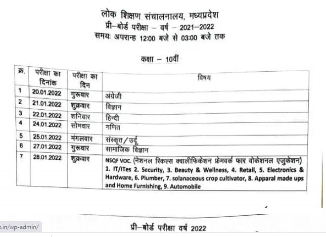 एमपी स्कूल शिक्षा विभाग (MP School Education Department) ने शैक्षणिक सत्र 2021-22 की कक्षा 10वीं एवं 12वीं की प्री-बोर्ड की परीक्षा की समय-सारणी जारी कर दी है। प्री-बोर्ड परीक्षा संचालन के संबंध में सभी संभागीय संयुक्त संचालक, जिला शिक्षा अधिकारी और विद्यालयों के प्राचार्य को विस्तृत दिशा-निर्देश जारी कर दिए गए हैं।