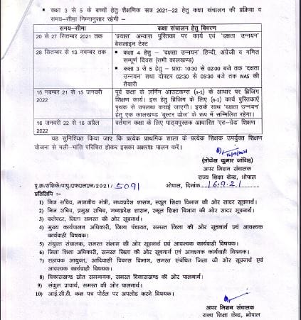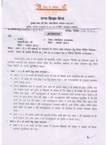 इसके अलावा कक्षा 2 के बच्चों के पास पिछले सत्र की कक्षा पहली की पाठ्यपुस्तक आदि उपलब्ध हो, तो ऐसे बच्चों को पहले सत्र की कक्षा एक की किताब शाला में लाने के निर्देश दिए जाएं, ऐसे बच्चे जिनके पास पहली कक्षा की किताबें नहीं है, उन्हें कॉपी, स्लेट, रनिंग ब्लैक बोर्ड आदि पर कक्षा एक की पाठ्यपुस्तक के आधार पर अभ्यास कराया जाए। कक्षा पहली व दूसरी के सभी बच्चों को आगामी निर्देश जारी होने तक कक्षा एक की दक्षता पर ही कार्य कराए जाएं। दूसरी क्लास की किताबों का उपयोग न किया जाए।