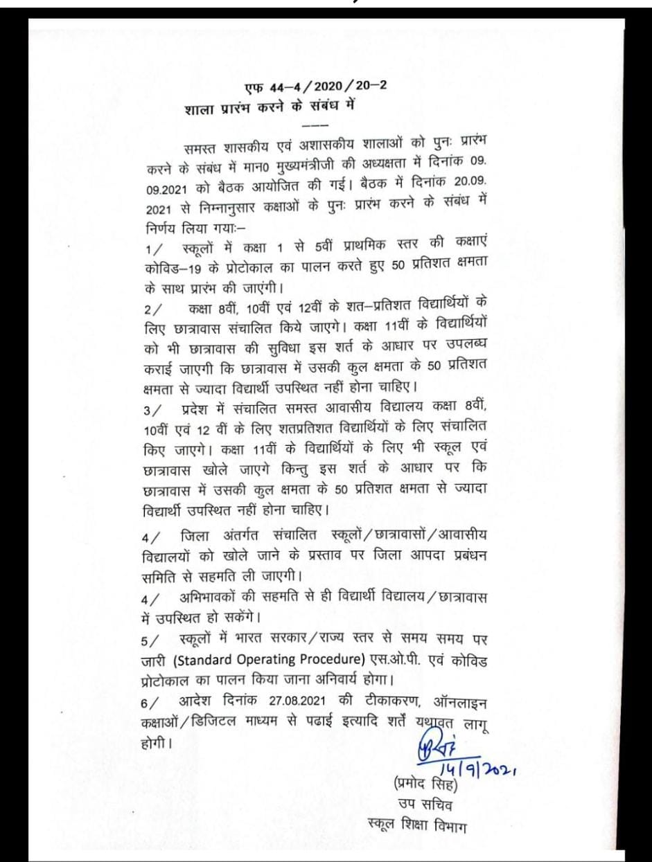 मध्य प्रदेश के स्कूल शिक्षा विभाग (MP School Education Department) ने 20 सितंबर से कक्षा 1 से 12वीं तक की सभी शासकीय और अशासकीय स्कूल (Government And Private School Reopen) खुलने जा रहे हैं।इसके तहत विद्यार्थियों (Students) और सभी शिक्षक एसओपी (Standard Operating Procedure SOP) एवं नियमों का पालन अनिवार्य होगा। 1 से लेकर 5वीं की प्राथमिक स्तर की कक्षाएं 50 प्रतिशत क्षमता के साथ खोली जाएंगी।दूसरी क्लास के बच्चों को अभी पहली क्लास का ही पुराना पाठ्यक्रम पढ़ाया जाएगा। एक शिक्षक ही दोनों कक्षाओं की एक साथ क्लास लेगा।